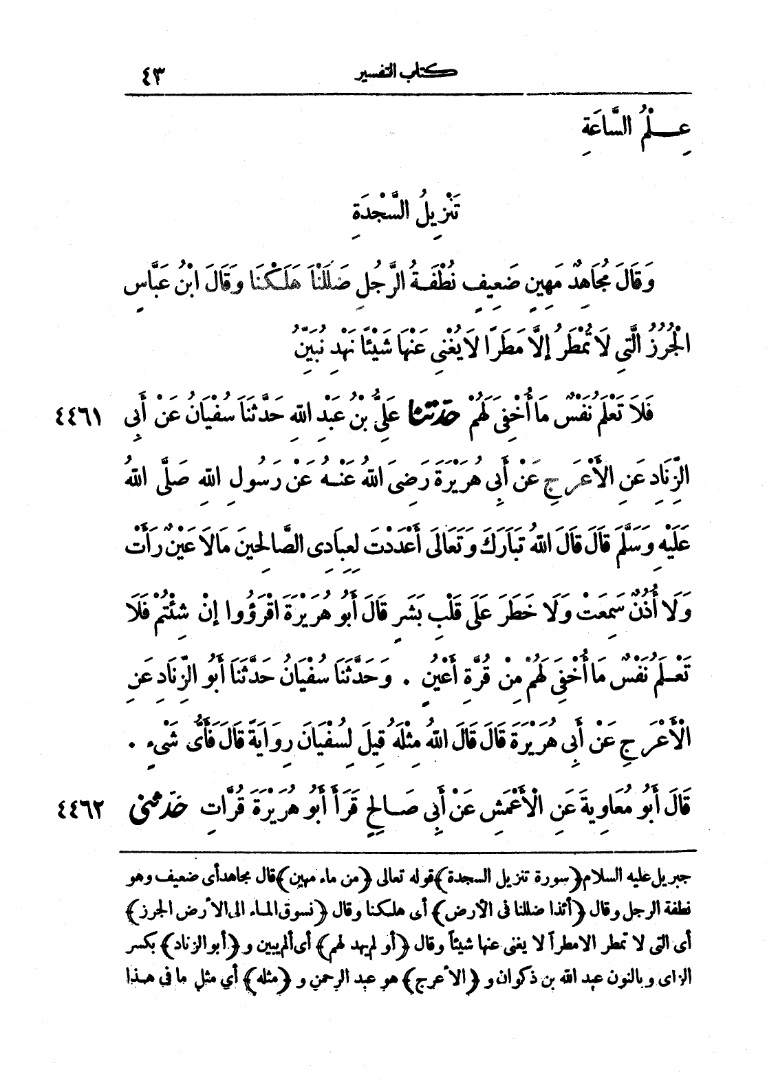 جبريل عليه السلام (سورة تنزيل السجدة) قوله تعالى (من ماء مهين) قال مجاهد أي ضعيف وهو نطفة الرجل وقال (أئذا ضللنا في الأرض) أي هلكنا وقال (نسوق الماء إلى الأرض الجرز) أي التي لا تمطر إلا مطراً لا يغني عنها شيئاً وقال (أو لم يهد لهم) أي ألم يبين و (أبو الزناد) بكسر الزاي وبالنون عبد الله بن ذكوان و (الأعرج) هو عبد الرحمن و (مثله) أي مثل ما في هذا