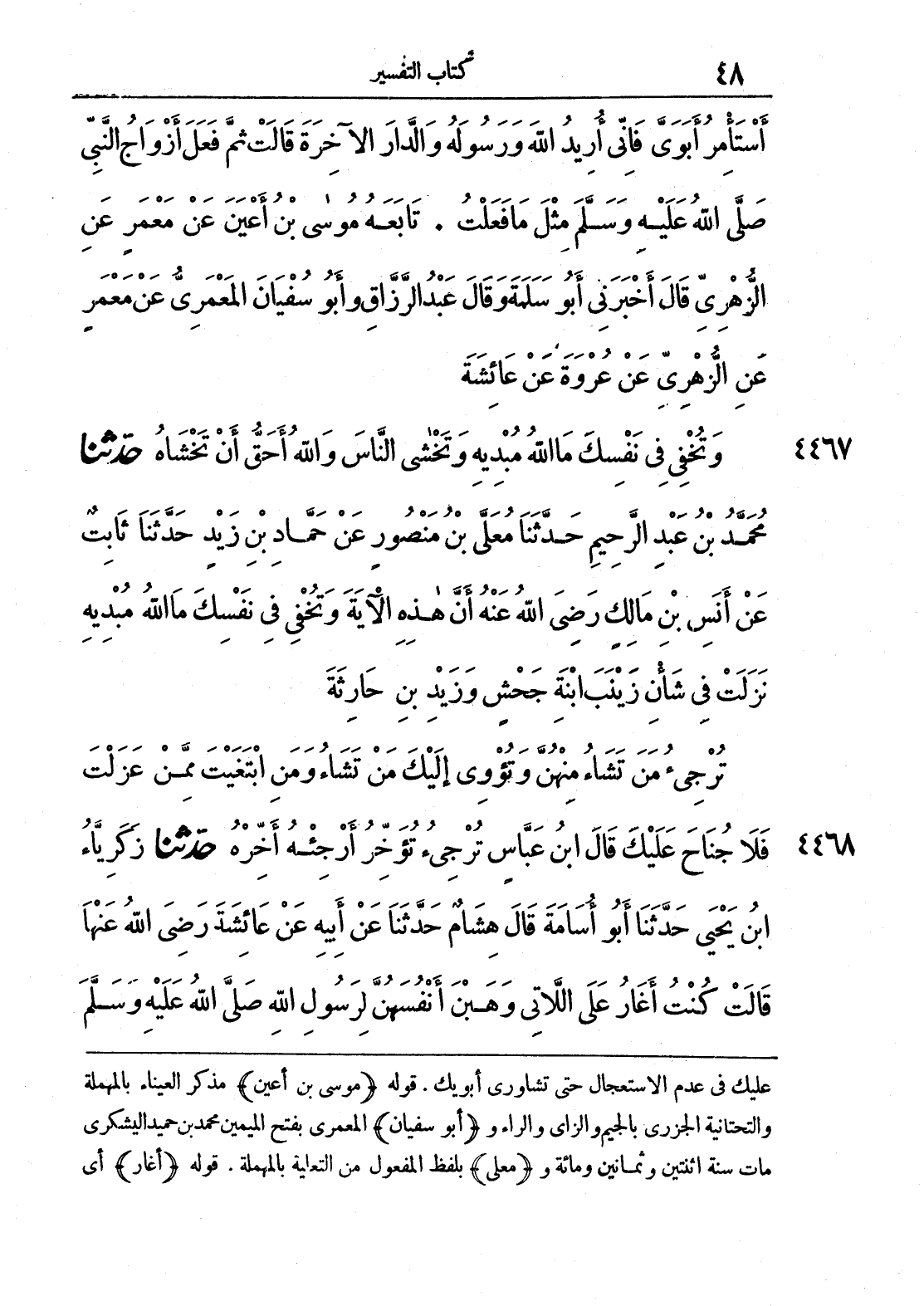 4467 - حَدَّثَنَا مُحَمَّدُ بْنُ عَبْدِ الرَّحِيمِ حَدَّثَنَا مُعَلَّى بْنُ مَنْصُورٍ عَنْ حَمَّادِ بْنِ زَيْدٍ حَدَّثَنَا ثَابِتٌ عَنْ أَنَسِ بْنِ مَالِكٍ رَضِيَ اللَّهُ عَنْهُ أَنَّ هَذِهِ الْآيَةَ {وَتُخْفِي فِي نَفْسِكَ مَا اللَّهُ مُبْدِيهِ} نَزَلَتْ فِي شَانِ زَيْنَبَ بِنْتِ جَحْشٍ وَزَيْدِ بْنِ حَارِثَةَ