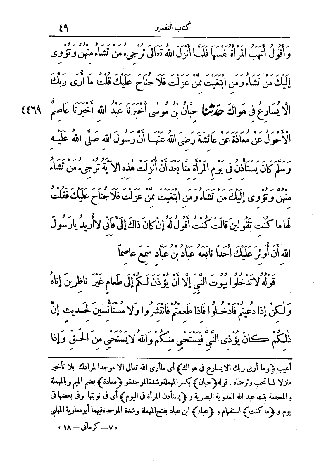 أعيب (وما أرى ربك ألا يسارع في هواك) أي ما أرى الله تعالى إلا موجداً لمرادك بلا تأخير منزلاً لما تحب وترضاه. قوله (حبان) بكسر المهملة وشدة الموحدة و (معاذة) بضم الميم وبالمهملة والمعجمة بنت عبد الله العدوية البصرية و (يستأذن المرأة في اليوم) أي نوبتها وفي بعضها في يوم و (ما كنت) استفهام و (عباد) ابن عباد بفتح المهملة وشدة الموحدة فيهما أبو معاوية المهلبي