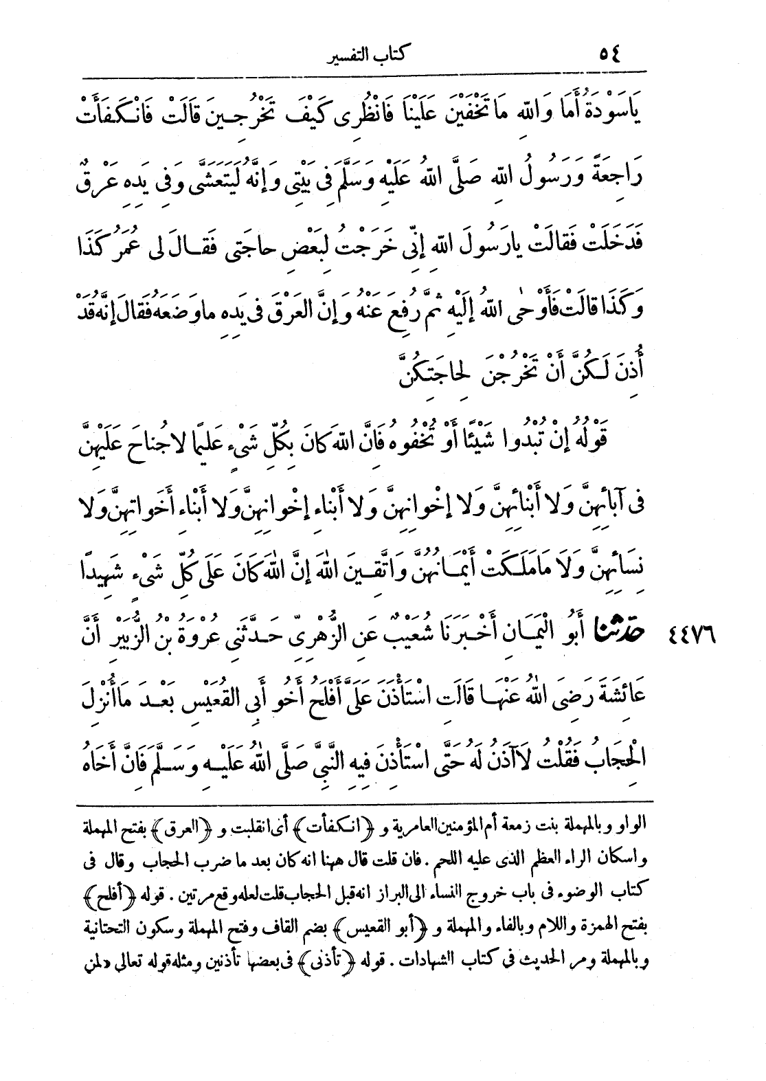 4476 - حَدَّثَنَا أَبُو الْيَمَانِ أَخْبَرَنَا شُعَيْبٌ عَنْ الزُّهْرِيِّ حَدَّثَنِي عُرْوَةُ بْنُ الزُّبَيْرِ أَنَّ عَائِشَةَ رَضِيَ اللَّهُ عَنْهَا قَالَتْ اسْتَاذَنَ عَلَيَّ أَفْلَحُ أَخُو أَبِي الْقُعَيْسِ بَعْدَمَا أُنْزِلَ الْحِجَابُ فَقُلْتُ لَا آذَنُ لَهُ حَتَّى أَسْتَاذِنَ فِيهِ النَّبِيَّ صَلَّى اللَّهُ عَلَيْهِ وَسَلَّمَ فَإِنَّ أَخَاهُ