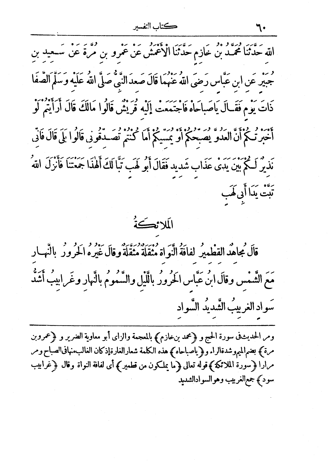 ومر الحديث في سورة الحج و (محمد بن خازم) بالمعجمة والزاي أبو معاوية الضرير و (عمرو بن مرة) بضم الميم وشدة الراء و (يا صباحاه) هذه الكلمة شعار الغارة إذ كان الغالب منها في الصباح ومر مراراً (سورة الملائكة) قوله تعالى (ما يملكون من قطمير) أي لفافة النواة وقال (غرابيب سود) جمع الغربيب وهو السواد الشديد