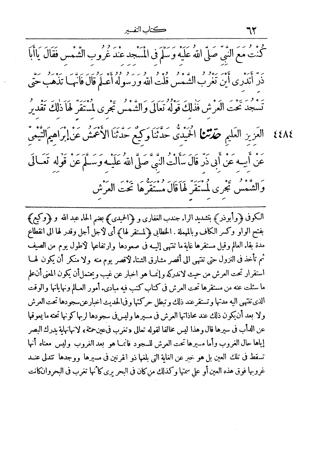 4484 - حَدَّثَنَا الْحُمَيْدِيُّ حَدَّثَنَا وَكِيعٌ حَدَّثَنَا الْأَعْمَشُ عَنْ إِبْرَاهِيمَ التَّيْمِيِّ عَنْ أَبِيهِ عَنْ أَبِي ذَرٍّ قَالَ سَأَلْتُ النَّبِيَّ صَلَّى اللَّهُ عَلَيْهِ وَسَلَّمَ عَنْ قَوْلِهِ تَعَالَى {وَالشَّمْسُ تَجْرِي لِمُسْتَقَرٍّ لَهَا} قَالَ مُسْتَقَرُّهَا تَحْتَ الْعَرْشِ