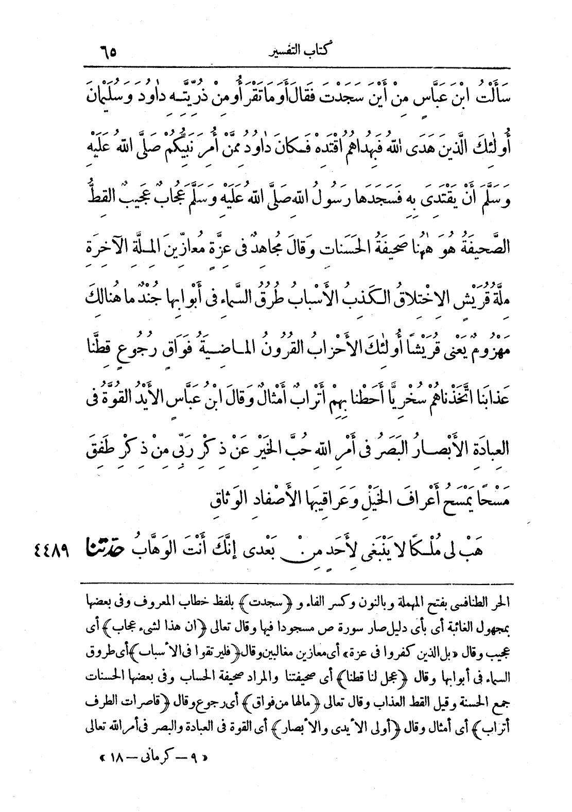 الحر الطنافسي بفتح المهملة وبالنون وكسر الفاء و (سجدت) بلفظ خطاب المعروف وفي بعضها بمجهول الغائبة أي بأي دليل صار سورة ص مسجودا فيها وقال تعالى (إن هذا لشيء عجاب) أي عجيب وقال ((بل الذين كفروا في عزة)) أي معازين مغالبين وقال (فليرتقوا في الأسباب) أي طروق السماء في أبوابها وقال (عجل لنا قطنا) أي صحيفتنا والمراد صحيفة الحساب وفي بعضها الحسنات جمع الحسنة وقيل القط العذاب وقال تعالى (ما لها من فواق) أي رجوع وقال (قاصرات الطرف أتراب) أي أمثال وقال (أولى الأيدي والأبصار) أي القوة في العبادة والبصر في أمر الله تعالى