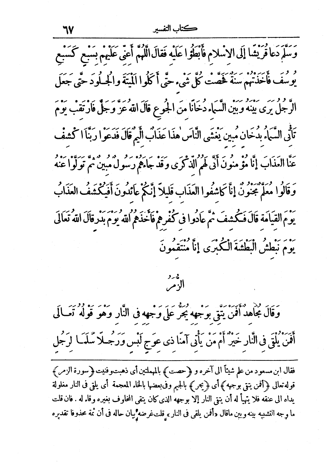 وَسَلَّمَ دَعَا قُرَيْشًا إِلَى الْإِسْلَامِ فَأَبْطَئُوا عَلَيْهِ فَقَالَ اللَّهُمَّ أَعِنِّي عَلَيْهِمْ بِسَبْعٍ كَسَبْعِ يُوسُفَ فَأَخَذَتْهُمْ سَنَةٌ فَحَصَّتْ كُلَّ شَيْءٍ حَتَّى أَكَلُوا الْمَيْتَةَ وَالْجُلُودَ حَتَّى جَعَلَ الرَّجُلُ يَرَى بَيْنَهُ وَبَيْنَ السَّمَاءِ دُخَانًا مِنْ الْجُوعِ قَالَ اللَّهُ عَزَّ وَجَلَّ {فَارْتَقِبْ يَوْمَ تَاتِي السَّمَاءُ بِدُخَانٍ مُبِينٍ يَغْشَى النَّاسَ هَذَا عَذَابٌ أَلِيمٌ} قَالَ فَدَعَوْا {رَبَّنَا اكْشِفْ عَنَّا الْعَذَابَ إِنَّا مُؤْمِنُونَ أَنَّى لَهُمْ الذِّكْرَى وَقَدْ جَاءَهُمْ رَسُولٌ مُبِينٌ ثُمَّ تَوَلَّوْا عَنْهُ وَقَالُوا مُعَلَّمٌ مَجْنُونٌ إِنَّا كَاشِفُو الْعَذَابِ قَلِيلًا إِنَّكُمْ عَائِدُونَ} أَفَيُكْشَفُ الْعَذَابُ يَوْمَ الْقِيَامَةِ قَالَ فَكُشِفَ ثُمَّ عَادُوا فِي كُفْرِهِمْ فَأَخَذَهُمْ اللَّهُ يَوْمَ بَدْرٍ قَالَ اللَّهُ تَعَالَى {يَوْمَ نَبْطِشُ الْبَطْشَةَ الْكُبْرَى إِنَّا مُنْتَقِمُونَ}