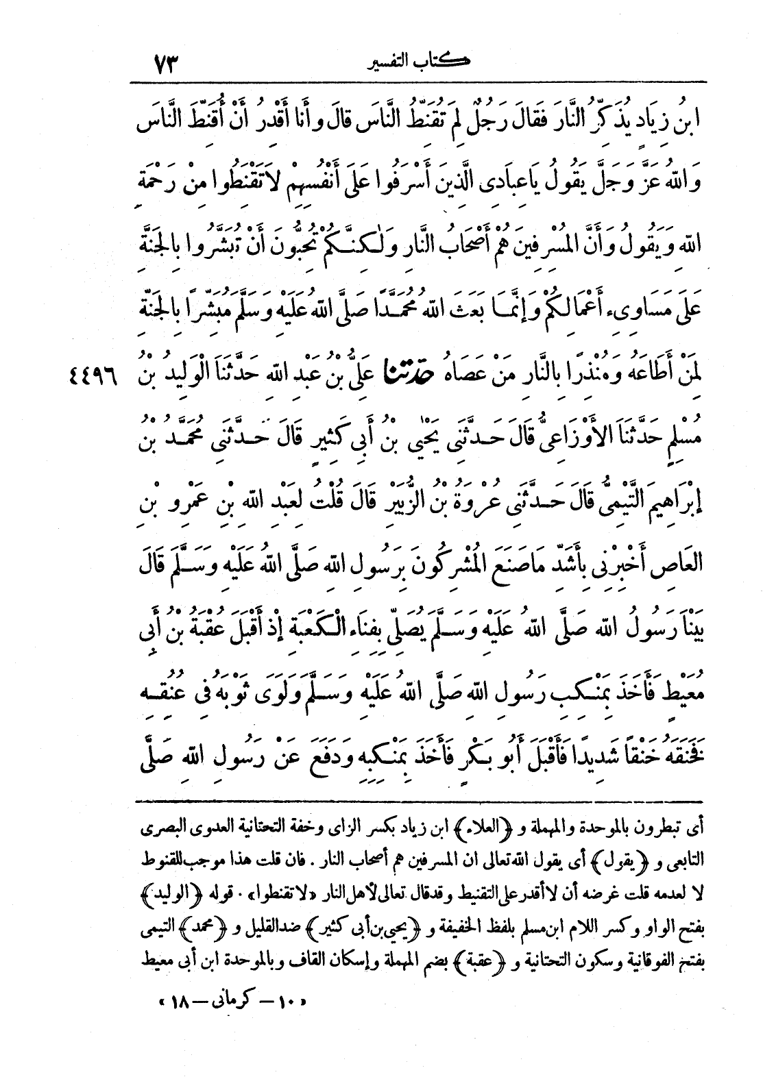 أي تبطرون بالموحدة والمهملة و (العلاء) ابن زياد بكسر الزاي وخفة التحتانية العدوى البصري التابعي و (يقول) أي يقول الله تعالى أن المسرفين هم أصحاب النار. فإن قلت هذا موجب للقنوط لا لعدمه قلت غرضه أن لا أقدر على التقنيط وقد قال تعالى لأهل النار «لا تقنطوا». قوله (الوليد) بفتح الواو وكسر اللام ابن مسلم بلفظ الخفيفة و (يحيي بن أبي كثير) ضد القليل و (محمد) التيمي بفتح الفوقانية وسكون التحتانية و (عقبة) بضم المهملة وإسكان القاف وبالموحدة ابن أبي معيط