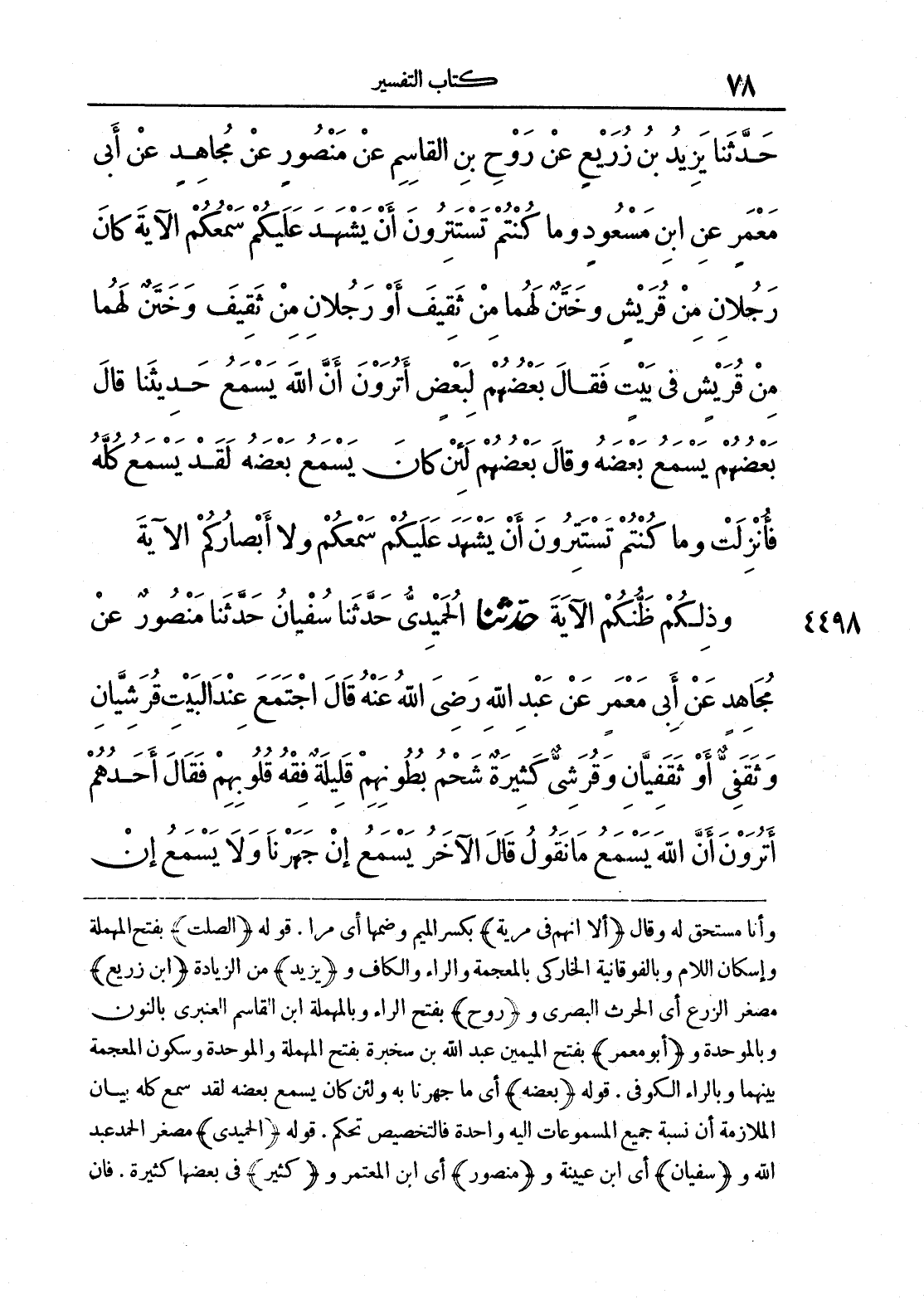 4498 - حَدَّثَنَا الْحُمَيْدِيُّ حَدَّثَنَا سُفْيَانُ حَدَّثَنَا مَنْصُورٌ عَنْ مُجَاهِدٍ عَنْ أَبِي مَعْمَرٍ عَنْ عَبْدِ اللَّهِ رَضِيَ اللَّهُ عَنْهُ قَالَ اجْتَمَعَ عِنْدَ الْبَيْتِ قُرَشِيَّانِ وَثَقَفِيٌّ أَوْ ثَقَفِيَّانِ وَقُرَشِيٌّ كَثِيرَةٌ شَحْمُ بُطُونِهِمْ قَلِيلَةٌ فِقْهُ قُلُوبِهِمْ فَقَالَ أَحَدُهُمْ أَتُرَوْنَ أَنَّ اللَّهَ يَسْمَعُ مَا نَقُولُ قَالَ الْآخَرُ يَسْمَعُ إِنْ جَهَرْنَا وَلَا يَسْمَعُ إِنْ