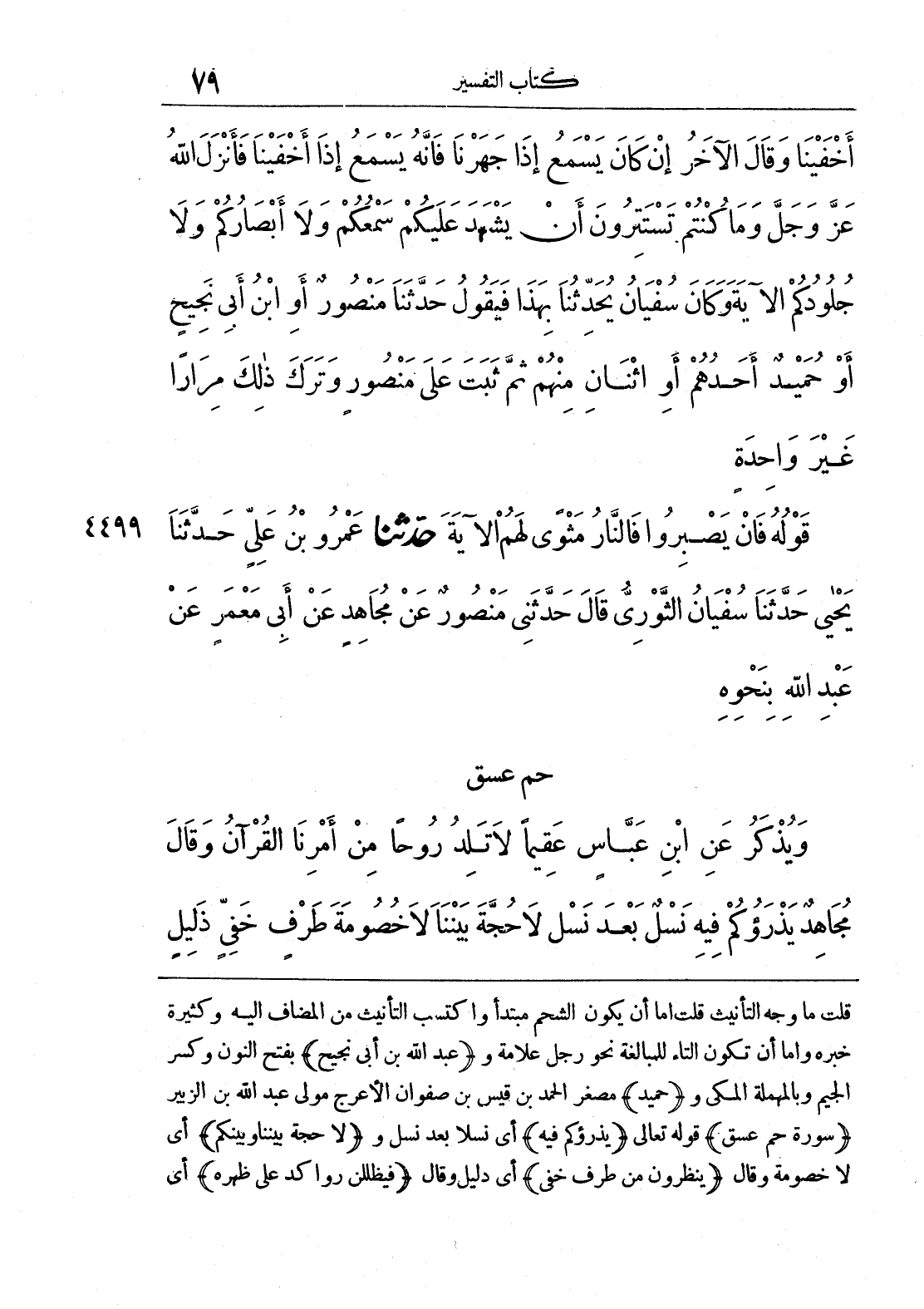 قلت ما وجه التأنيث قلت أما أن يكون الشحم مبتدأ واكتسب التأنيث من المضاف إليه وكثيرة خبره وأما أن تكون التاء للمبالغة نحو رجل علامة و (عبد الله بن أبي نجيح) بفتح النون وكسر الجيم وبالمهملة المكي و (حميد) مصغر الحمد بن قيس بن صفوان الأعرج مولى عبد الله بن الزبير (سورة حم عسق) قوله تعالى (يذرؤكم فيه) أي نسلا بعد نسل و (لا حجة بيننا وبينكم) أي لا خصومة وقال (ينظرون من طرف خفي) أي دليل وقال (فيظللن رواكد على ظهره) أي