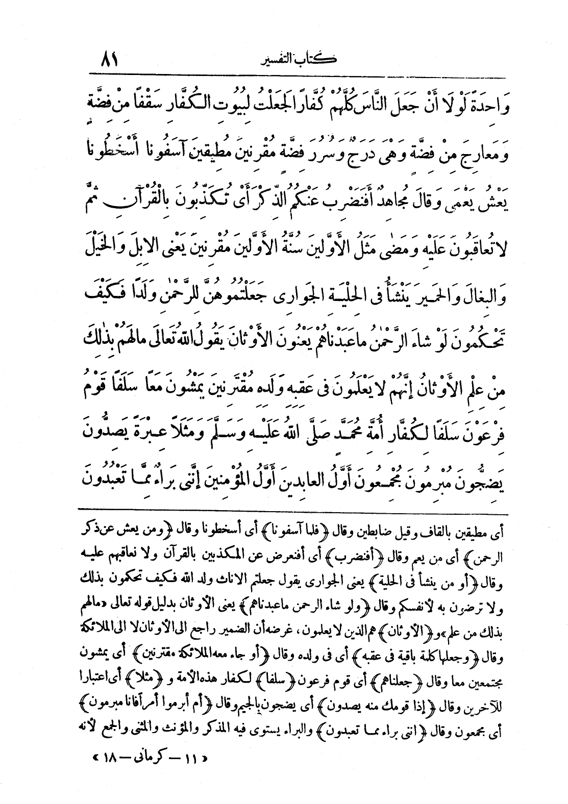 وَاحِدَةً} لَوْلَا أَنْ جَعَلَ النَّاسَ كُلَّهُمْ كُفَّارًا لَجَعَلْتُ لِبُيُوتِ الْكُفَّارِ {سَقْفًا مِنْ فِضَّةٍ وَمَعَارِجَ} مِنْ فِضَّةٍ وَهِيَ دَرَجٌ وَسُرُرَ فِضَّةٍ {مُقْرِنِينَ} مُطِيقِينَ {آسَفُونَا} أَسْخَطُونَا {يَعْشُ} يَعْمَى وَقَالَ مُجَاهِدٌ {أَفَنَضْرِبُ عَنْكُمْ الذِّكْرَ} أَيْ تُكَذِّبُونَ بِالْقُرْآنِ ثُمَّ لَا تُعَاقَبُونَ عَلَيْهِ {وَمَضَى مَثَلُ الْأَوَّلِينَ} سُنَّةُ الْأَوَّلِينَ {وَمَا كُنَّا لَهُ مُقْرِنِينَ} يَعْنِي الْإِبِلَ وَالْخَيْلَ وَالْبِغَالَ وَالْحَمِيرَ {يَنْشَأُ فِي الْحِلْيَةِ} الْجَوَارِي جَعَلْتُمُوهُنَّ لِلرَّحْمَنِ وَلَدًا فَكَيْفَ تَحْكُمُونَ {لَوْ شَاءَ الرَّحْمَنُ مَا عَبَدْنَاهُمْ} يَعْنُونَ الْأَوْثَانَ يَقُولُ اللَّهُ تَعَالَى {مَا لَهُمْ بِذَلِكَ مِنْ عِلْمٍ} أَيْ الْأَوْثَانُ إِنَّهُمْ لَا يَعْلَمُونَ {فِي عَقِبِهِ} وَلَدِهِ {مُقْتَرِنِينَ} يَمْشُونَ مَعًا {سَلَفًا} قَوْمُ فِرْعَوْنَ سَلَفًا لِكُفَّارِ أُمَّةِ مُحَمَّدٍ صَلَّى اللَّهُ عَلَيْهِ وَسَلَّمَ {وَمَثَلًا} عِبْرَةً {يَصِدُّونَ} يَضِجُّونَ {مُبْرِمُونَ} مُجْمِعُونَ {أَوَّلُ الْعَابِدِينَ} أَوَّلُ الْمُؤْمِنِينَ وَقَالَ غَيْرُهُ {إِنَّنِي بَرَاءٌ مِمَّا تَعْبُدُونَ}
