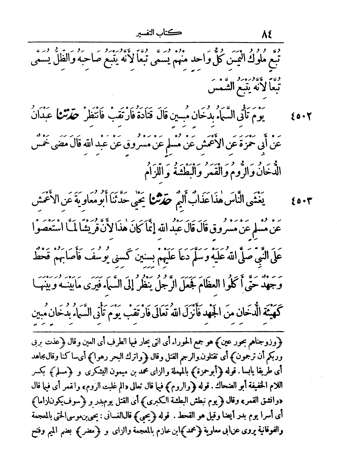 (وزوجناهم بحور عين) هو جمع الحوراء أي التي يحار فيها الطرف أي العين وقال (عذت بربي وربكم أن ترجمون) أي تقتلون والرجم القتل وقال (واترك البحر رهواً) أي ساكناً وقال مجاهد أي طريقاً يابساً. قوله (أبو حمزة) بالمهملة والزاي محمد بن ميمون اليشكرى و (مسلم) بكسر اللام الخفيفة أبو الضحاك. قوله (والروم) فيما قال تعالى «الم غلبت الروم» والقمر أي فيما قال «وانشق القمر» وقال (يوم نبطش البطشة الكبرى) أي القتل يوم بدر و (سوف يكون لزاما) أي أسرا يوم بدر أيضاً وقيل هو القحط. قوله (يحيي) قال الغساني: يحيي بن موسى الختى بالمعجمة والفوقانية يروي عن أبي معاوية (محمد) ابن خازم بالمعجمة والزاي و (مضر) بضم الميم وفتح
