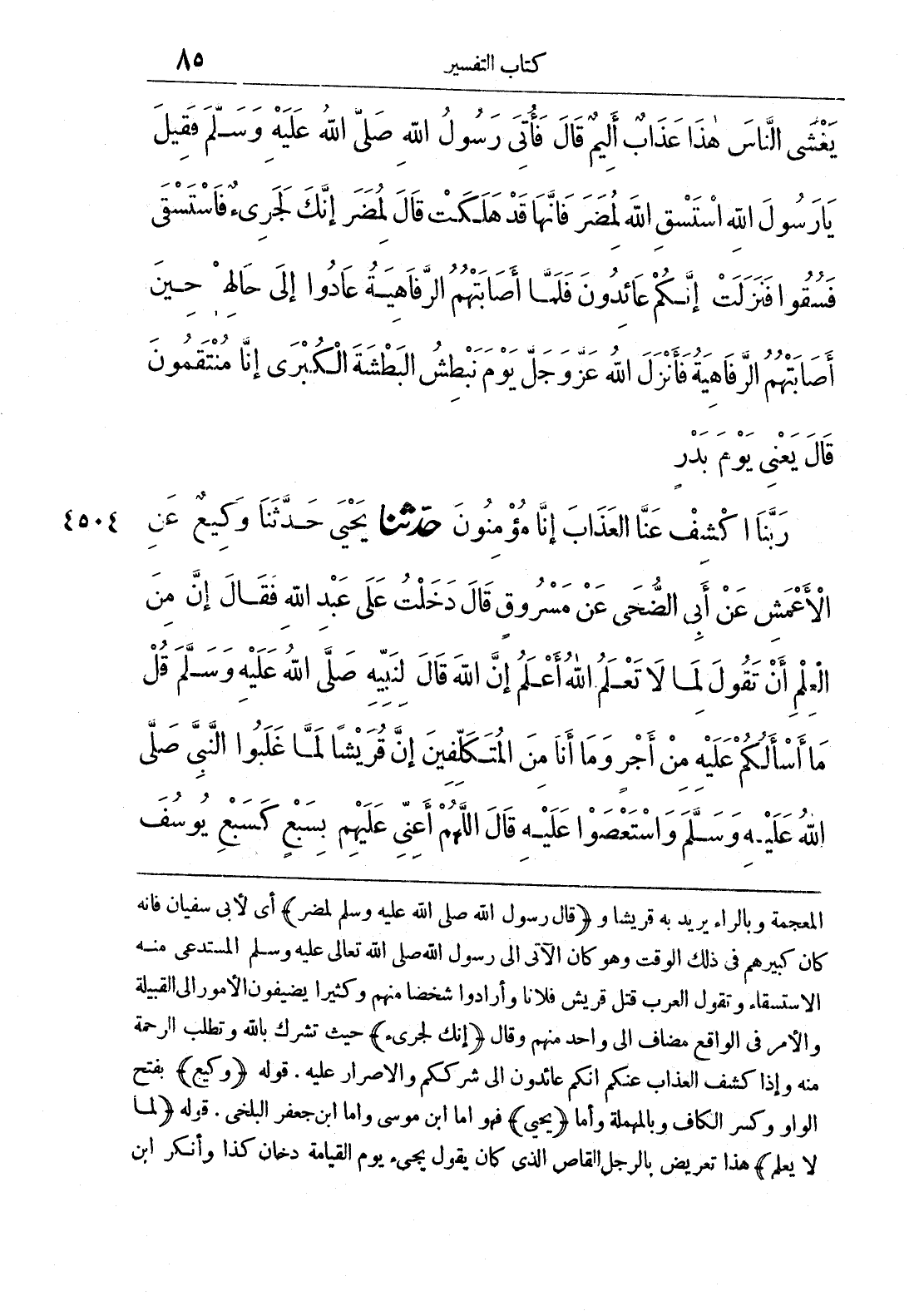 4504 - حَدَّثَنَا يَحْيَى حَدَّثَنَا وَكِيعٌ عَنْ الْأَعْمَشِ عَنْ أَبِي الضُّحَى عَنْ مَسْرُوقٍ قَالَ دَخَلْتُ عَلَى عَبْدِ اللَّهِ فَقَالَ إِنَّ مِنْ الْعِلْمِ أَنْ تَقُولَ لِمَا لَا تَعْلَمُ اللَّهُ أَعْلَمُ إِنَّ اللَّهَ قَالَ لِنَبِيِّهِ صَلَّى اللَّهُ عَلَيْهِ وَسَلَّمَ {قُلْ مَا أَسْأَلُكُمْ عَلَيْهِ مِنْ أَجْرٍ وَمَا أَنَا مِنْ الْمُتَكَلِّفِينَ} إِنَّ قُرَيْشًا لَمَّا غَلَبُوا النَّبِيَّ صَلَّى اللَّهُ عَلَيْهِ وَسَلَّمَ وَاسْتَعْصَوْا عَلَيْهِ قَالَ اللَّهُمَّ أَعِنِّي عَلَيْهِمْ بِسَبْعٍ كَسَبْعِ يُوسُفَ