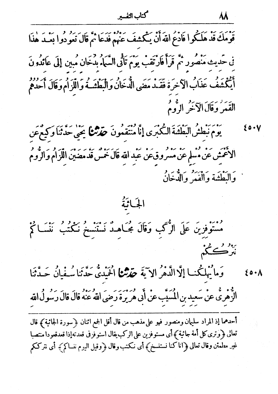 أحدهما إذ المراد سليمان ومنصور فهو على مذهب من قال أقل الجمع اثنان (سورة الجاثية) قال تعالى (وترى كل أمة جاثية) أي مستوفزين على الركب يقال استوفز في قعدته إذا قعد قعوداً منتصباً غير مطمئن وقال تعالى (إنا كنا نستنسخ) أي نكتب وقال (وقيل اليوم ننساكم) أي نترككم