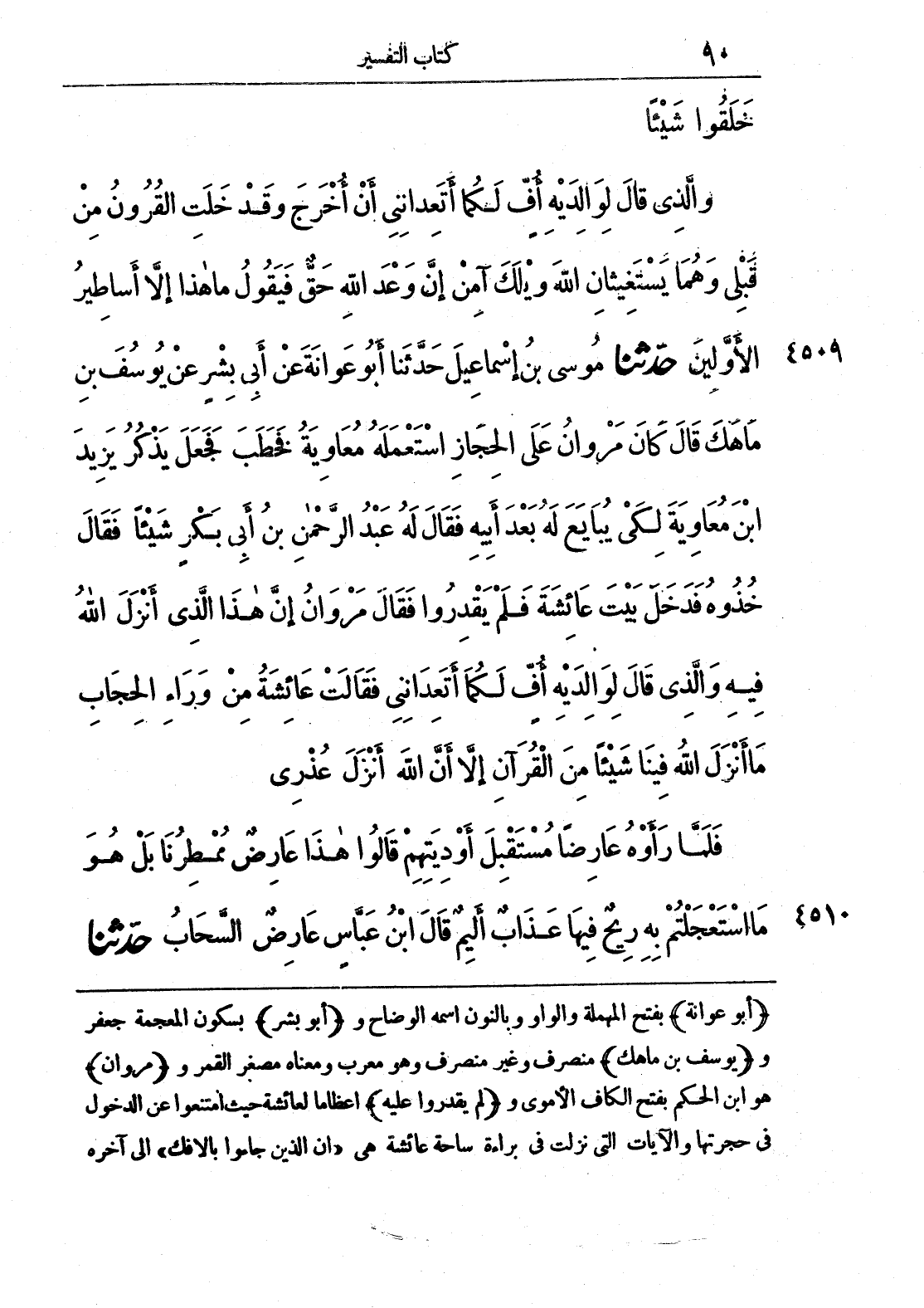 (أبو عوانة) بفتح المهملة والواو وبالنون اسمه الوضاح و (أبو بشر) بسكون المعجمة جعفر و (يوسف بن ماهك) منصرف وغير منصرف وهو معرب ومعناه ومصغر القمر و (مروان) هو ابن الحكم بفتح الكاف الأموي و (لم يقدروا عليه) إعظاماً لعائشة حيث امتنعوا عن الدخول في حجرتها والآيات التي نزلت في براءة ساحة عائشة هي «إن الذين جاءوا بالافك» إلى آخره