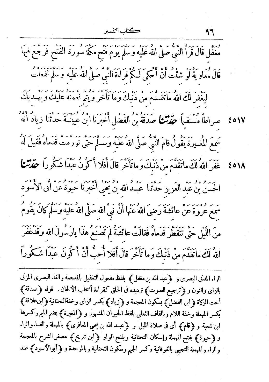 4517 - حَدَّثَنَا صَدَقَةُ بْنُ الْفَضْلِ أَخْبَرَنَا ابْنُ عُيَيْنَةَ حَدَّثَنَا زِيَادٌ هُوَ ابْنُ عِلَاقَةَ أَنَّهُ سَمِعَ الْمُغِيرَةَ يَقُولُ قَامَ النَّبِيُّ صَلَّى اللَّهُ عَلَيْهِ وَسَلَّمَ حَتَّى تَوَرَّمَتْ قَدَمَاهُ فَقِيلَ لَهُ غَفَرَ اللَّهُ لَكَ مَا تَقَدَّمَ مِنْ ذَنْبِكَ وَمَا تَأَخَّرَ قَالَ أَفَلَا أَكُونُ عَبْدًا شَكُورًا