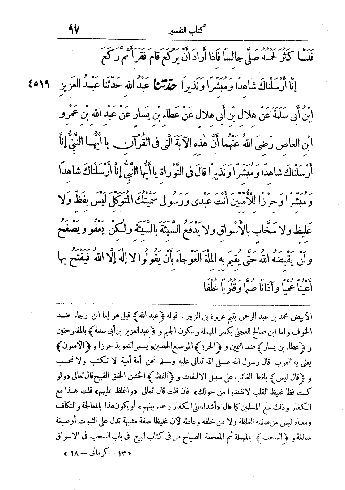 4519 - حَدَّثَنَا عَبْدُ اللَّهِ بْنُ مَسْلَمَةَ حَدَّثَنَا عَبْدُ الْعَزِيزِ بْنُ أَبِي سَلَمَةَ عَنْ هِلَالِ بْنِ أَبِي هِلَالٍ عَنْ عَطَاءِ بْنِ يَسَارٍ عَنْ عَبْدِ اللَّهِ بْنِ عَمْرِو بْنِ الْعَاصِ رَضِيَ اللَّهُ عَنْهُمَا أَنَّ هَذِهِ الْآيَةَ الَّتِي فِي الْقُرْآنِ يَا أَيُّهَا النَّبِيُّ {إِنَّا أَرْسَلْنَاكَ شَاهِدًا وَمُبَشِّرًا وَنَذِيرًا} قَالَ فِي التَّوْرَاةِ يَا أَيُّهَا النَّبِيُّ إِنَّا أَرْسَلْنَاكَ شَاهِدًا وَمُبَشِّرًا وَحِرْزًا لِلْأُمِّيِّينَ أَنْتَ عَبْدِي وَرَسُولِي سَمَّيْتُكَ الْمُتَوَكِّلَ لَيْسَ بِفَظٍّ وَلَا غَلِيظٍ وَلَا سَخَّابٍ بِالْأَسْوَاقِ وَلَا يَدْفَعُ السَّيِّئَةَ بِالسَّيِّئَةِ وَلَكِنْ يَعْفُو وَيَصْفَحُ وَلَنْ يَقْبِضَهُ اللَّهُ حَتَّى يُقِيمَ بِهِ الْمِلَّةَ الْعَوْجَاءَ بِأَنْ يَقُولُوا لَا إِلَهَ إِلَّا اللَّهُ فَيَفْتَحَ بِهَا أَعْيُنًا عُمْيًا وَآذَانًا صُمًّا وَقُلُوبًا غُلْفًا