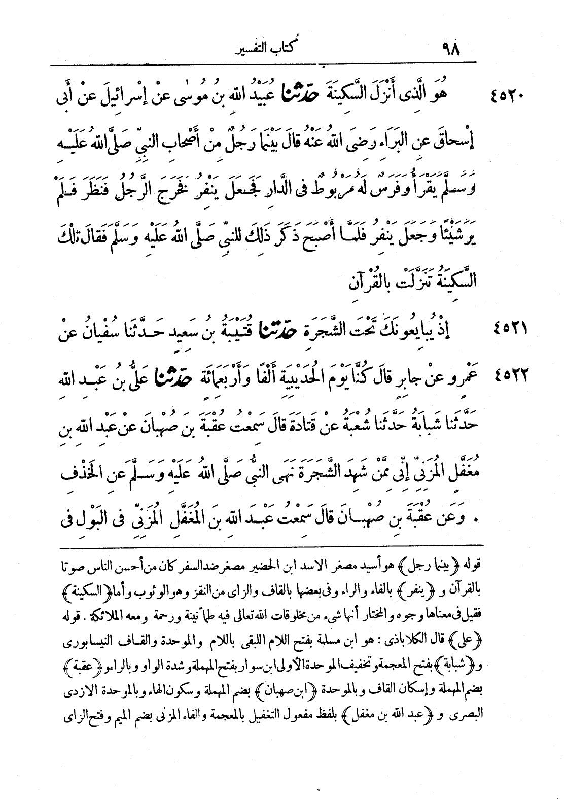 4520 - حَدَّثَنَا عُبَيْدُ اللَّهِ بْنُ مُوسَى عَنْ إِسْرَائِيلَ عَنْ أَبِي إِسْحَاقَ عَنْ الْبَرَاءِ رَضِيَ اللَّهُ عَنْهُ قَالَ بَيْنَمَا رَجُلٌ مِنْ أَصْحَابِ النَّبِيِّ صَلَّى اللَّهُ عَلَيْهِ وَسَلَّمَ يَقْرَأُ وَفَرَسٌ لَهُ مَرْبُوطٌ فِي الدَّارِ فَجَعَلَ يَنْفِرُ فَخَرَجَ الرَّجُلُ فَنَظَرَ فَلَمْ يَرَ شَيْئًا وَجَعَلَ يَنْفِرُ فَلَمَّا أَصْبَحَ ذَكَرَ ذَلِكَ لِلنَّبِيِّ صَلَّى اللَّهُ عَلَيْهِ وَسَلَّمَ فَقَالَ السَّكِينَةُ تَنَزَّلَتْ بِالْقُرْآنِ