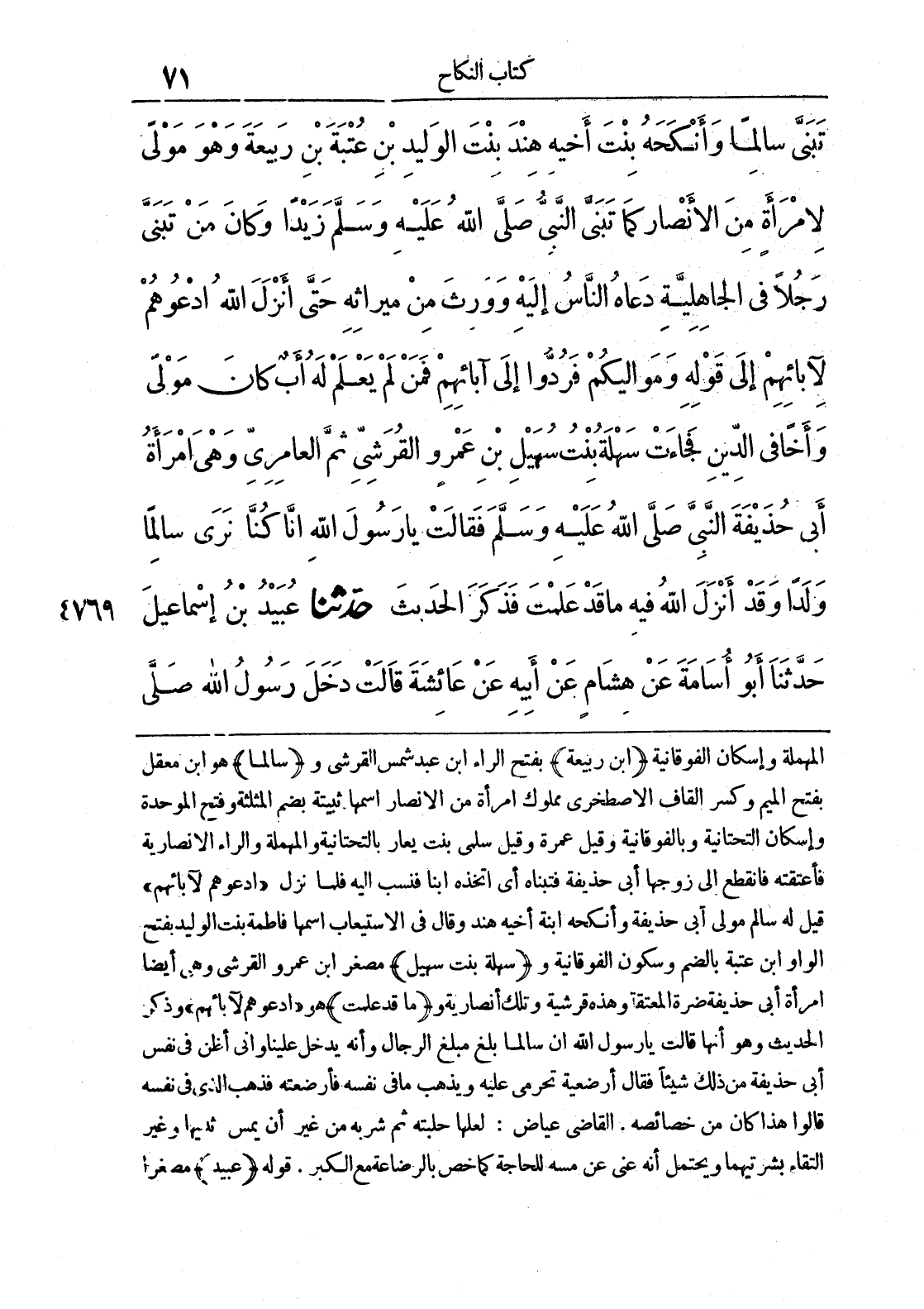 تَبَنَّى سَالِمًا وَأَنْكَحَهُ بِنْتَ أَخِيهِ هِنْدَ بِنْتَ الْوَلِيدِ بْنِ عُتْبَةَ بْنِ رَبِيعَةَ وَهُوَ مَوْلًى لِامْرَأَةٍ مِنْ الْأَنْصَارِ كَمَا تَبَنَّى النَّبِيُّ صَلَّى اللَّهُ عَلَيْهِ وَسَلَّمَ زَيْدًا وَكَانَ مَنْ تَبَنَّى رَجُلًا فِي الْجَاهِلِيَّةِ دَعَاهُ النَّاسُ إِلَيْهِ وَوَرِثَ مِنْ مِيرَاثِهِ حَتَّى أَنْزَلَ اللَّهُ {ادْعُوهُمْ لِآبَائِهِمْ إِلَى قَوْلِهِ وَمَوَالِيكُمْ} فَرُدُّوا إِلَى آبَائِهِمْ فَمَنْ لَمْ يُعْلَمْ لَهُ أَبٌ كَانَ مَوْلًى وَأَخًا فِي الدِّينِ فَجَاءَتْ سَهْلَةُ بِنْتُ سُهَيْلِ بْنِ عَمْرٍو الْقُرَشِيِّ ثُمَّ العَامِرِيِّ وَهِيَ امْرَأَةُ أَبِي حُذَيْفَةَ بْنِ عُتْبَةَ النَّبِيَّ صَلَّى اللَّهُ عَلَيْهِ وَسَلَّمَ فَقَالَتْ يَا رَسُولَ اللَّهِ إِنَّا كُنَّا نَرَى سَالِمًا وَلَدًا وَقَدْ أَنْزَلَ اللَّهُ فِيهِ مَا قَدْ عَلِمْتَ فَذَكَرَ الْحَدِيثَ