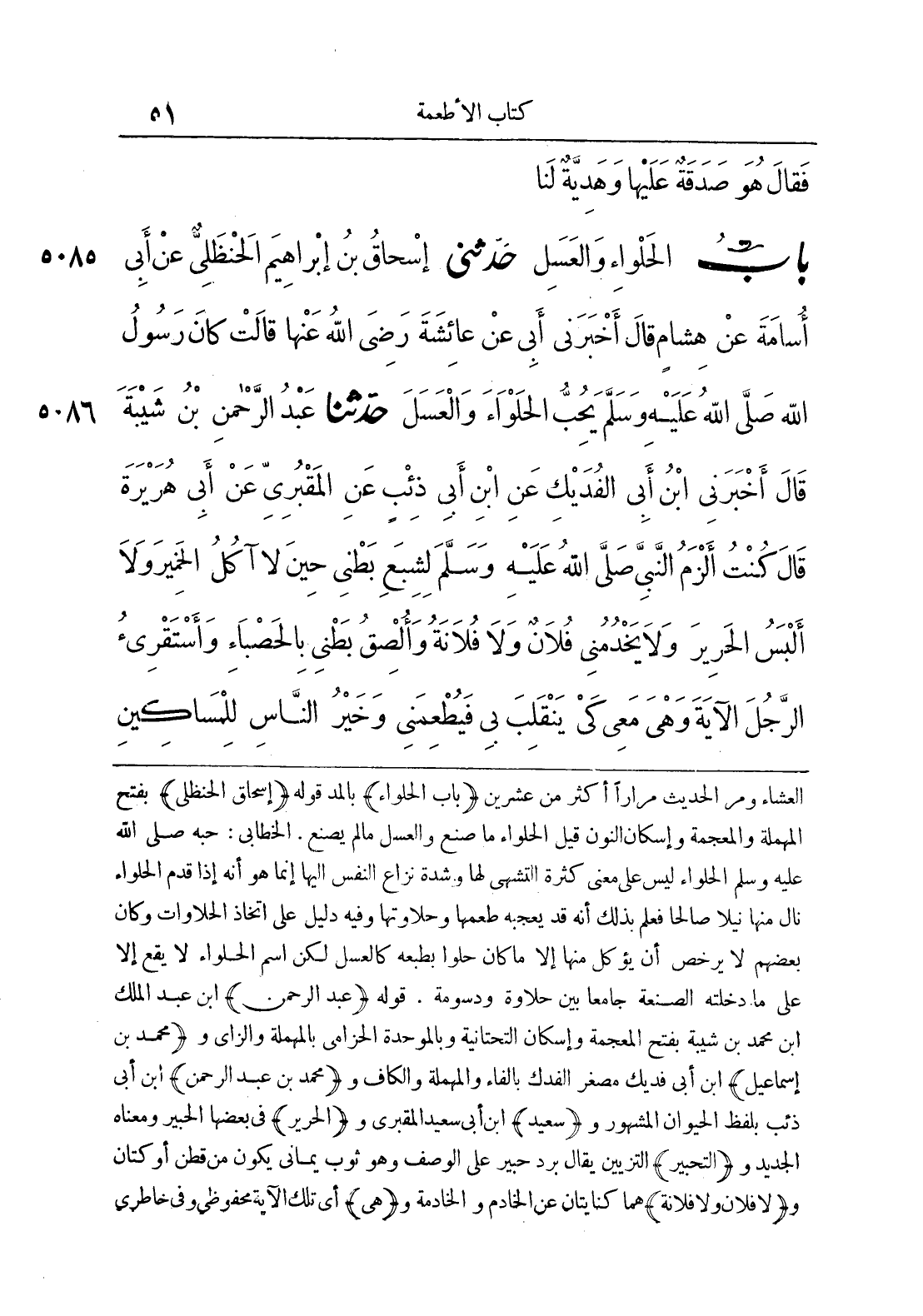 5085 - حَدَّثَنِى إِسْحَاقُ بْنُ إِبْرَاهِيمَ الْحَنْظَلِىُّ عَنْ أَبِى أُسَامَةَ عَنْ هِشَامٍ قَالَ أَخْبَرَنِى أَبِى عَنْ عَائِشَةَ - رضى الله عنها- قَالَتْ كَانَ رَسُولُ اللَّهِ - صلى الله عليه وسلم - يُحِبُّ الْحَلْوَاءَ وَالْعَسَلَ.