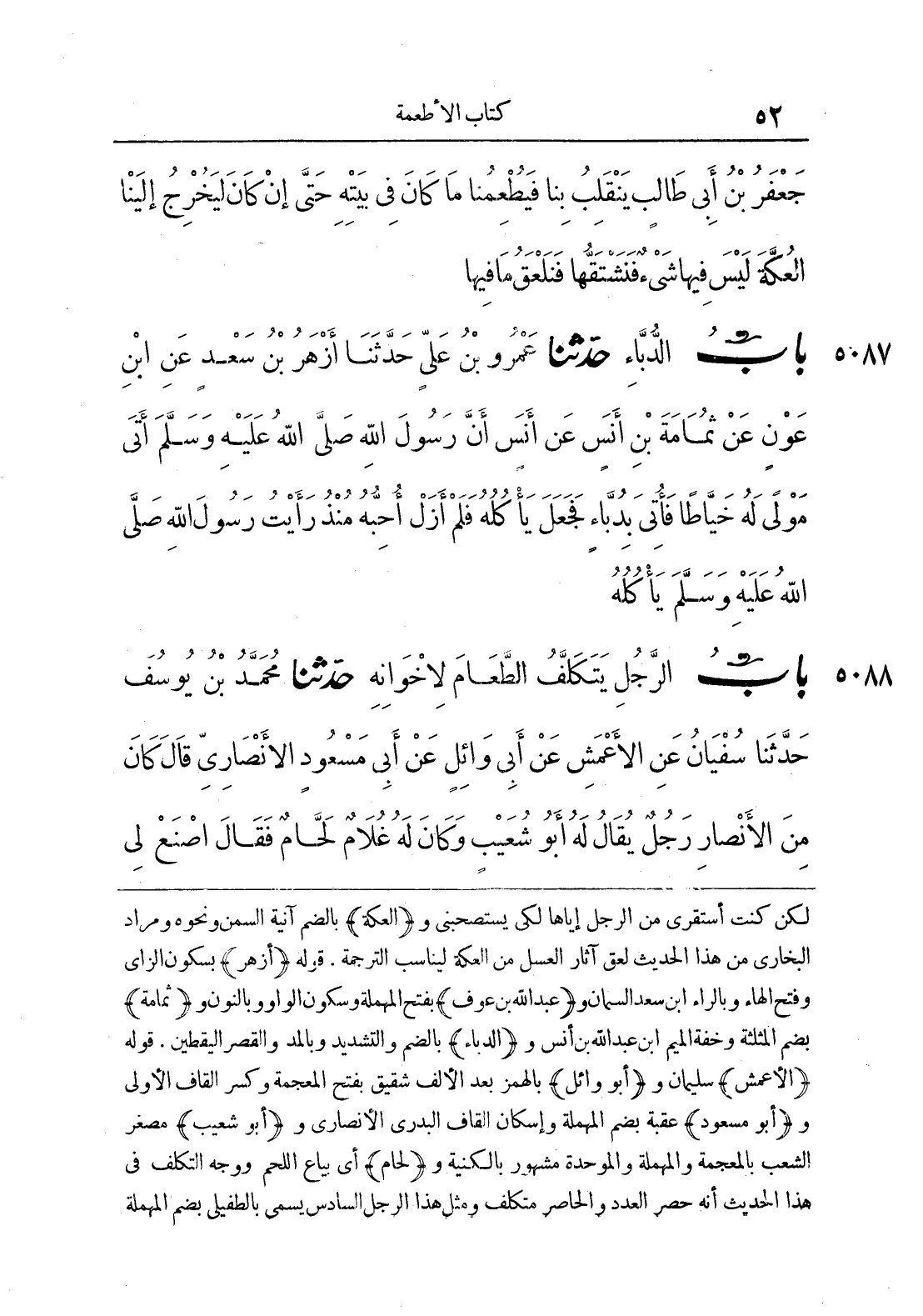 لكن كنت أستقري من الرجل إياها لكي يستصحبني و (العكة) بالضم آنية السمن ونحوه ومراد البخاري من هذا الحديث لعق آثار العسل من العكة ليناسب الترجمة. قوله (أزهر) بسكون الزاي وفتح الهاء وبالراء ابن سعد السمان و (عبد الله بن عوف) بفتح المهملة وسكون الواو وبالنون و (ثمامة) بضم المثلثة وخفة الميم ابن عبد الله بن أنس و (الدباء) بالضم والتشديد وبالمد والقصر اليقطين. قوله (الأعمش) سليمان و (أبو وائل) بالهمز بعد الألف شقيق بفتح المعجمة وكسر القاف الأولى و (أبو مسعود) عقبة بضم المهملة وإسكان القاف البدري الأنصاري و (أبو شعيب) مصغر الشعب بالمعجمة والمهملة والموحدة مشهور بالكنية و (لحام) أي بياع اللحم ووجه التكلف في هذا الحديث أنه حصر العدد والحاصر متكلف ومثل هذا الرجل السادس يسمى بالطفيلي بضم المهملة