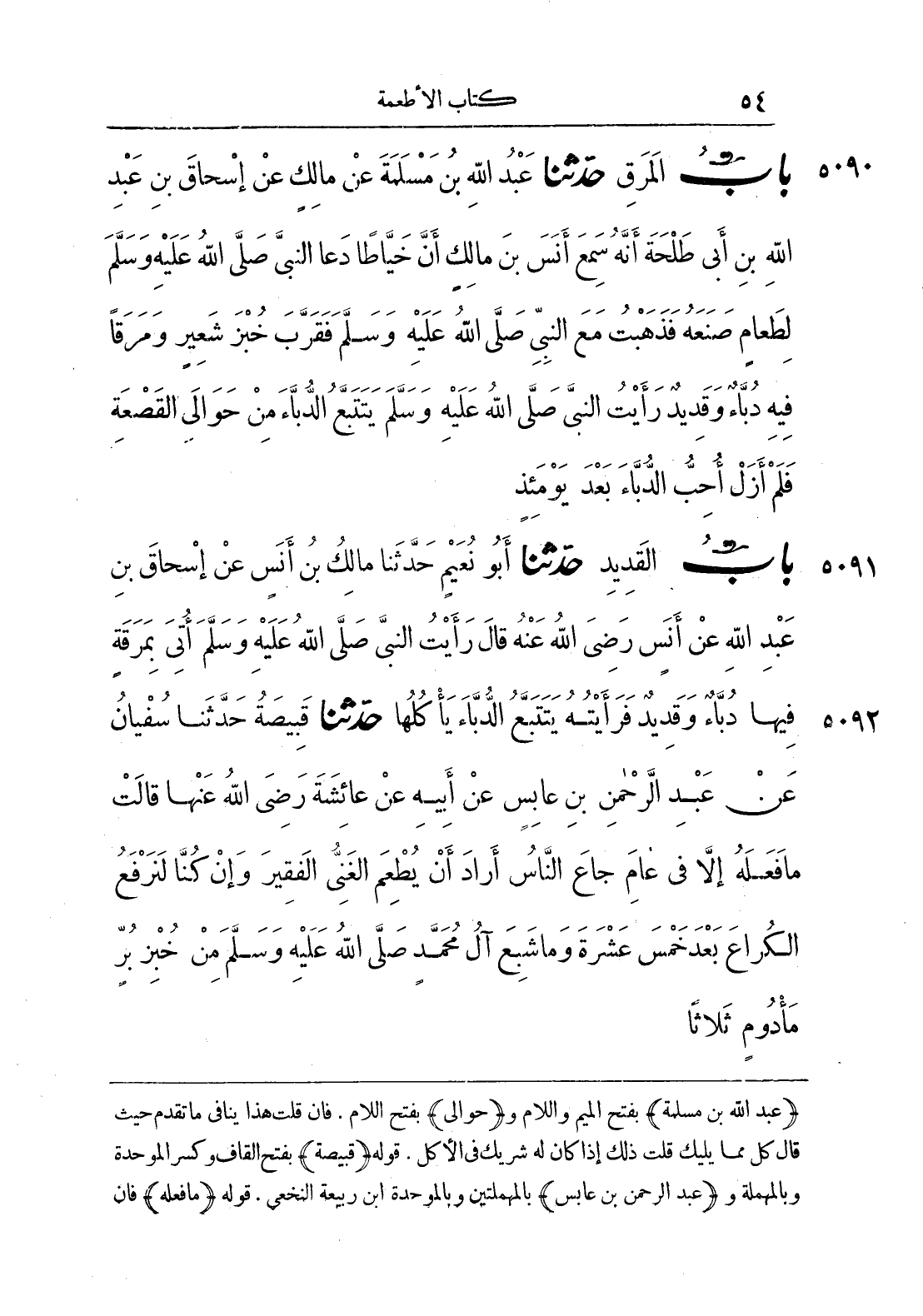 5090 - حَدَّثَنَا عَبْدُ اللَّهِ بْنُ مَسْلَمَةَ عَنْ مَالِكٍ عَنْ إِسْحَاقَ بْنِ عَبْدِ اللَّهِ بْنِ أَبِى طَلْحَةَ أَنَّهُ سَمِعَ أَنَسَ بْنَ مَالِكٍ أَنَّ خَيَّاطاً دَعَا النَّبِىَّ - صلى الله عليه وسلم - لِطَعَامٍ صَنَعَهُ، فَذَهَبْتُ مَعَ النَّبِىِّ - صلى الله عليه وسلم - فَقَرَّبَ خُبْزَ شَعِيرٍ وَمَرَقاً فِيهِ دُبَّاءٌ وَقَدِيدٌ، فَرَأَيْتُ النَّبِىَّ - صلى الله عليه وسلم - يَتَتَبَّعُ الدُّبَّاءَ مِنْ حَوَالَىِ الْقَصْعَةِ، فَلَمْ أَزَلْ أُحِبُّ الدُّبَّاءَ بَعْدَ يَوْمِئِذٍ.