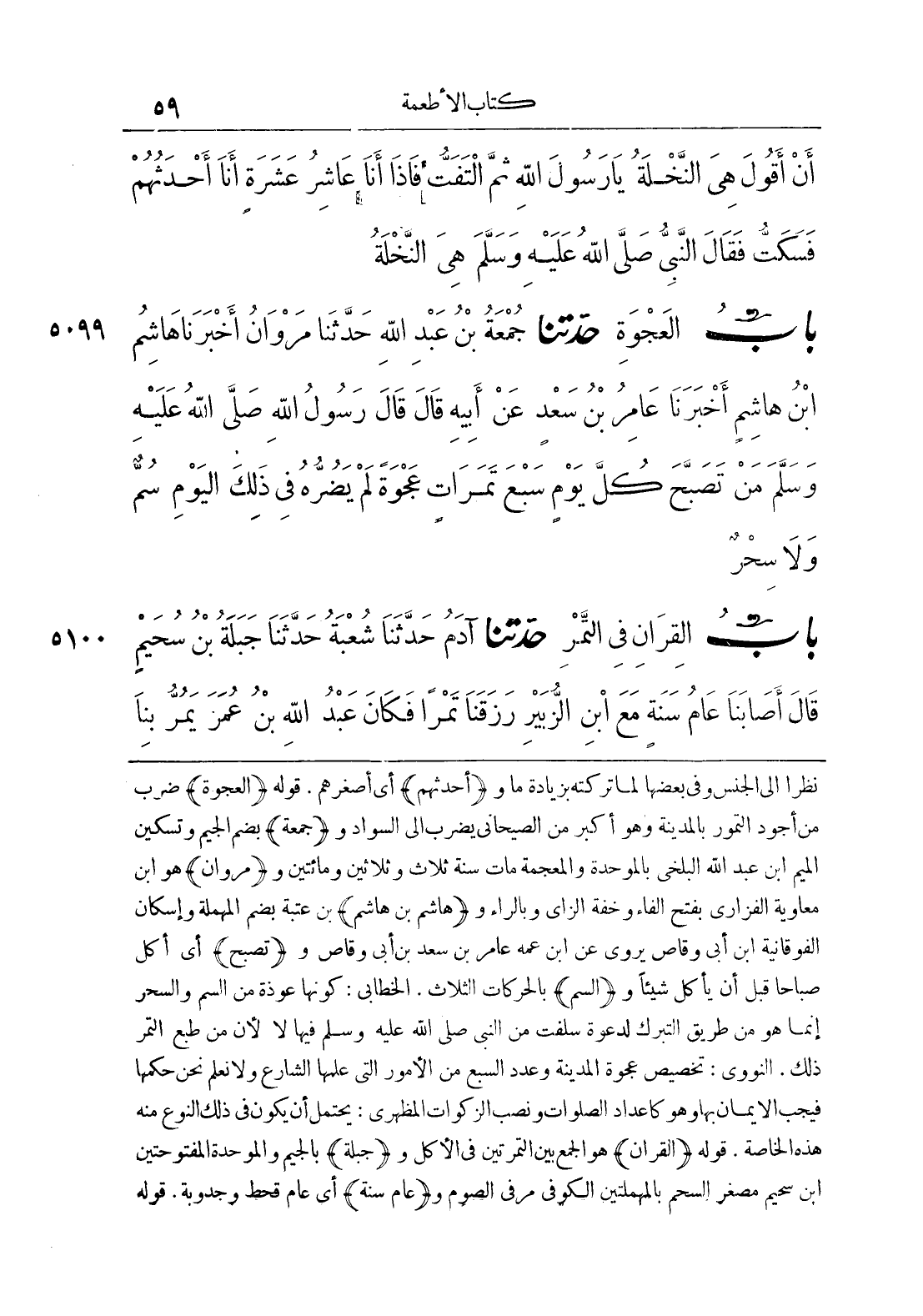 نظراً إلى الجنس وفي بعضها لما تركته بزيادة ما و (أحدثهم) أي أصغرهم. قوله (العجوة) ضرب من أجود التمور بالمدينة وهو أكبر من الصحياني يضرب إلى السواد و (جمعة) بضم الجيم وتسكين الميم ابن عبد الله البلخي بالموحدة والمعجمة مات سنة ثلاث وثلاثين ومائتين و (مروان) هو ابن معاوية الفزاري بفتح الفاء وخفة الزاي وبالراء و (هاشم بن هاشم) بن عتبة بضم المهملة وإسكان الفوقانية ابن أبي وقاص يروي عن ابن عمه عامر بن سعد بن أبي وقاص و (تصبح) أي أكل صباحاً قبل أن يأكل شيئاً و (السم) بالحركات الثلاث. الخطابي: كونها عودة من السم والسحر إنما هو من ريق التبرك لدعوة سلفت نم النبي - صلى الله عليه وسلم - فيها لا لأن من طبع التمر ذلك. النووي: تخصيص عجوة المدينة وعدد السبع من الأمر والتي علمها الشارع ولا نعلم نحن حكمها فيجب الإيمان بها وهو كإعداد الصلوات ونصب الزكوات المظهري: يحتمل أن يكون في ذلك النوع منه هذه الخاصة. قوله (القران) هو الجمع بين التمرتين في الأكل و (جبلة) بالجيم والموحدة المفتوحتين ابن سحيم مصغر السحم بالمهملتين الكوفي مر في الصوم و (عام سنة) أي عام قحط وجدوبة. قوله
