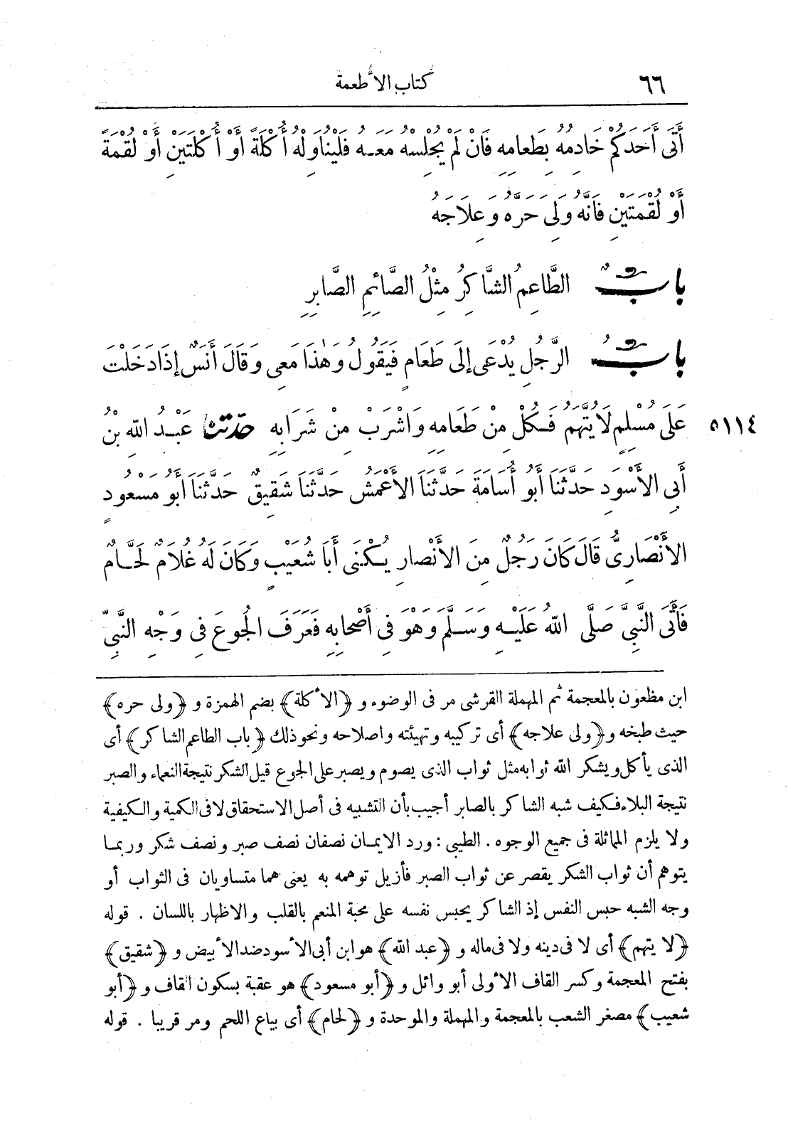 5114 - حَدَّثَنَا عَبْدُ اللَّهِ بْنُ أَبِى الأَسْوَدِ حَدَّثَنَا أَبُو أُسَامَةَ حَدَّثَنَا الأَعْمَشُ حَدَّثَنَا شَقِيقٌ حَدَّثَنَا أَبُو مَسْعُودٍ الأَنْصَارِىُّ قَالَ كَانَ رَجُلٌ مِنَ الأَنْصَارِ يُكْنَى أَبَا شُعَيْبٍ، وَكَانَ لَهُ غُلاَمٌ لَحَّامٌ، فَأَتَى النَّبِىَّ - صلى الله عليه وسلم - وَهْوَ فِى أَصْحَابِهِ، فَعَرَفَ الْجُوعَ فِى وَجْهِ النَّبِىِّ