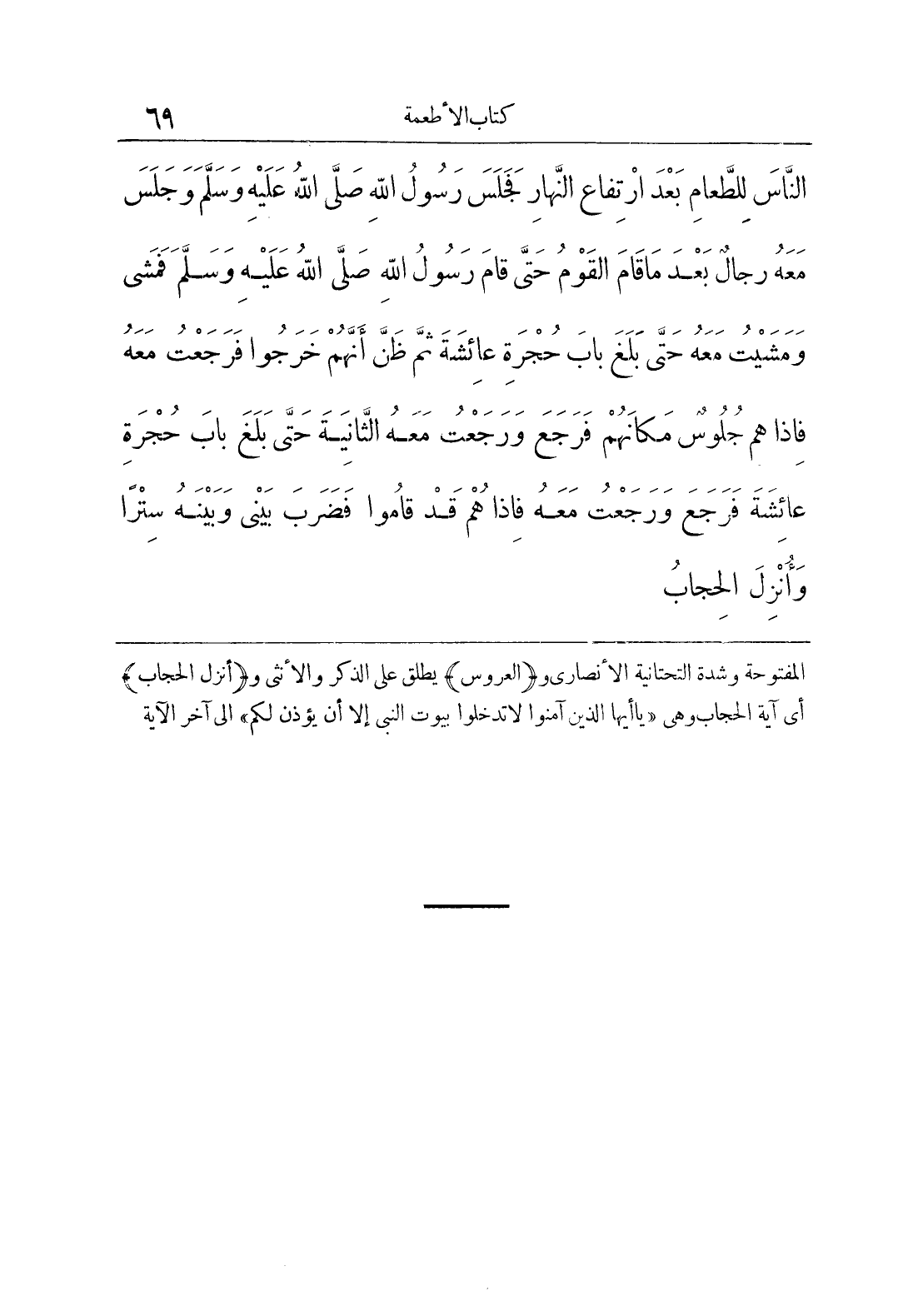 المفتوحة وشدة التحتانية الأنصاري و (العروس) يطلق على الذكر والأنثى و (أنزل الحجاب) أي آية الحجاب وهي (يا أيها الذين آمنوا لا تدخلوا بيوت النبي إلا أن يؤذن لكم) إلى آخر الآية