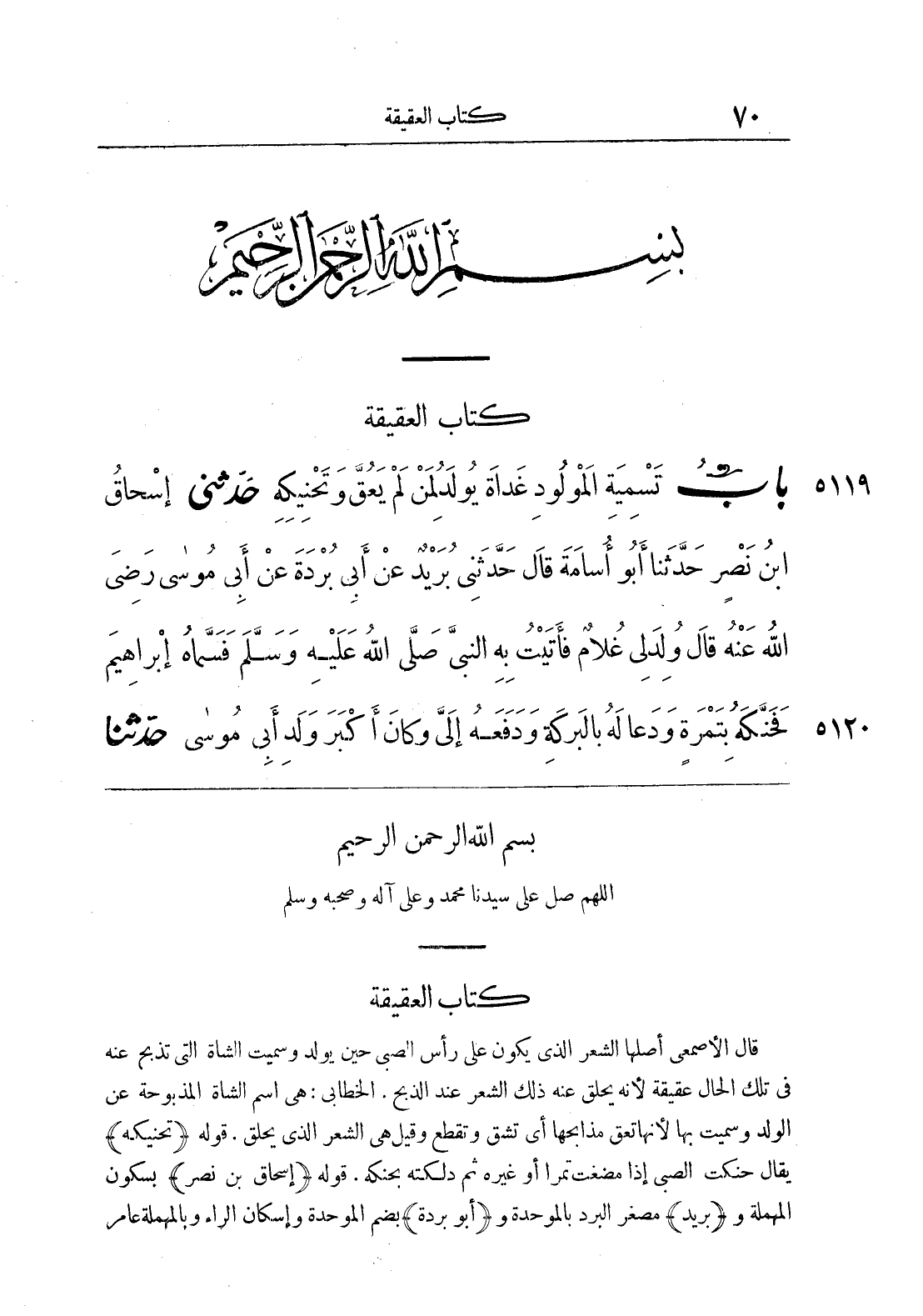 قال الأصمعي أصلها الشعر الذي يكون على رأس الصبي حين يولد وسميت الشاة التي تذبح عنه في تلك الحال عقيقة لأنه يحلق عنه ذلك الشعر عند الذبح. الخطابي: هي اسم الشاة المذبوحة عن الولد وسميت بها لأنها تعق مذابحها أي تشق وتقطع وقيل هي الشعر الذي يحلق. قوله (تحنيكه) يقال حنكت الصبي إذا مضغت تمراً أو غيره ثم دلكته بحنكه. قوله (إسحاق بن نصر) بسكون المهملة و (بريد) مصغر البرد بالموحدة و (أبو بردة) بضم الموحدة وإسكان الراء وبالمهملة عامر