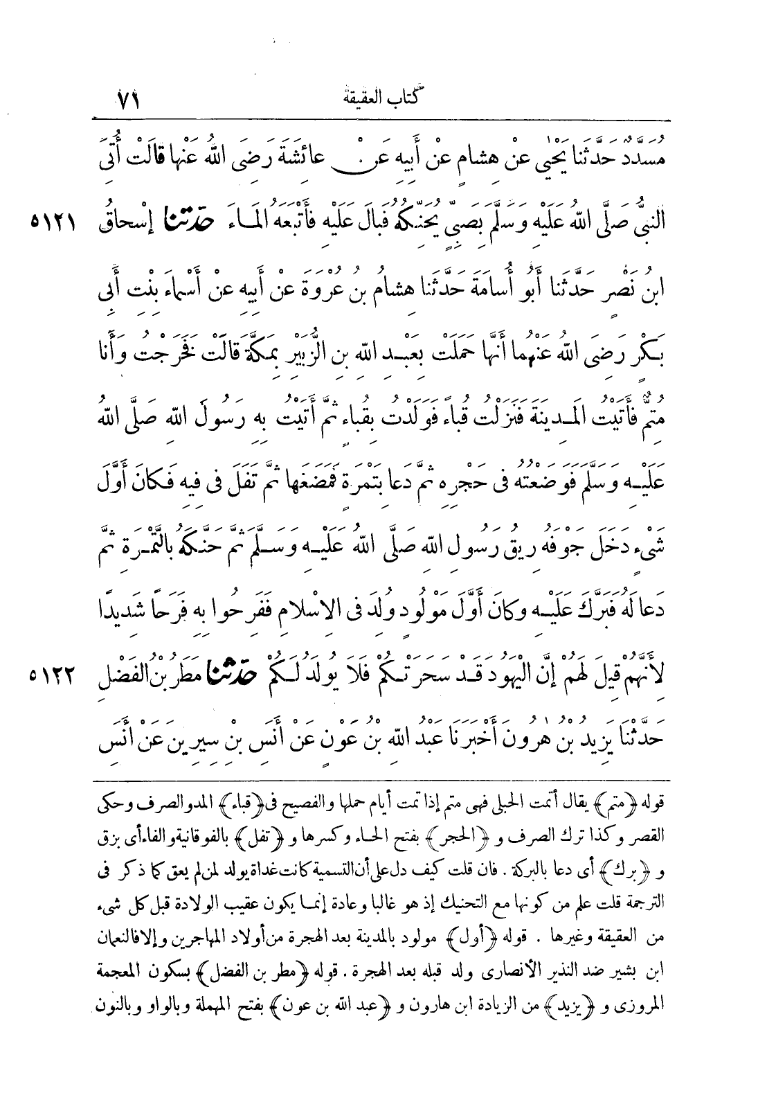 5121 - حَدَّثَنَا إِسْحَاقُ بْنُ نَصْرٍ حَدَّثَنَا أَبُو أُسَامَةَ حَدَّثَنَا هِشَامُ بْنُ عُرْوَةَ عَنْ أَبِيهِ عَنْ أَسْمَاءَ بِنْتِ أَبِى بَكْرٍ - رضى الله عنهما - أَنَّهَا حَمَلَتْ بِعَبْدِ اللَّهِ بْنِ الزُّبَيْرِ بِمَكَّةَ قَالَتْ فَخَرَجْتُ وَأَنَا مُتِمٌّ، فَأَتَيْتُ الْمَدِينَةَ فَنَزَلْتُ قُبَاءً فَوَلَدْتُ بِقُبَاءٍ، ثُمَّ أَتَيْتُ بِهِ رَسُولَ اللَّهِ - صلى الله عليه وسلم - فَوَضَعْتُهُ فِى حَجْرِهِ، ثُمَّ دَعَا بِتَمْرَةٍ فَمَضَغَهَا، ثُمَّ تَفَلَ فِى فِيهِ فَكَانَ أَوَّلَ شَىْءٍ دَخَلَ جَوْفَهُ رِيقُ رَسُولِ اللَّهِ - صلى الله عليه وسلم - ثُمَّ حَنَّكَهُ بِالتَّمْرَةِ، ثُمَّ دَعَا لَهُ فَبَرَّكَ عَلَيْهِ، وَكَانَ أَوَّلَ مَوْلُودٍ وُلِدَ فِى الإِسْلاَمِ، فَفَرِحُوا بِهِ فَرَحاً شَدِيداً، لأَنَّهُمْ قِيلَ لَهُمْ إِنَّ الْيَهُودَ قَدْ سَحَرَتْكُمْ فَلاَ يُولَدُ لَكُمْ.