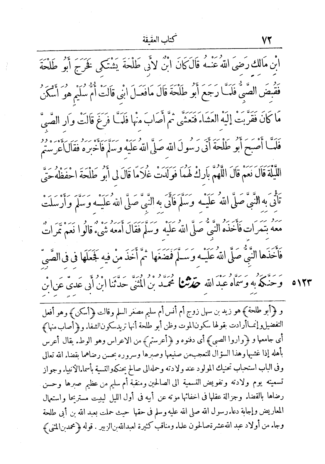 ابْنِ مَالِكٍ - رضى الله عنه - قَالَ كَانَ ابْنٌ لأَبِى طَلْحَةَ يَشْتَكِى، فَخَرَجَ أَبُو طَلْحَةَ، فَقُبِضَ الصَّبِىُّ فَلَمَّا رَجَعَ أَبُو طَلْحَةَ قَالَ مَا فَعَلَ ابْنِى قَالَتْ أُمُّ سُلَيْمٍ هُوَ أَسْكَنُ مَا كَانَ. فَقَرَّبَتْ إِلَيْهِ الْعَشَاءَ فَتَعَشَّى، ثُمَّ أَصَابَ مِنْهَا، فَلَمَّا فَرَغَ قَالَتْ وَارِ الصَّبِىَّ. فَلَمَّا أَصْبَحَ أَبُو طَلْحَةَ أَتَى رَسُولَ اللَّهِ - صلى الله عليه وسلم - فَأَخْبَرَهُ فَقَالَ «أَعْرَسْتُمُ اللَّيْلَةَ». قَالَ نَعَمْ. قَالَ «اللَّهُمَّ بَارِكْ لَهُمَا». فَوَلَدَتْ غُلاَماً قَالَ لِى أَبُو طَلْحَةَ احْفَظْهُ حَتَّى تَاتِىَ بِهِ النَّبِىَّ - صلى الله عليه وسلم - فَأَتَى بِهِ النَّبِىَّ - صلى الله عليه وسلم - وَأَرْسَلَتْ مَعَهُ بِتَمَرَاتٍ، فَأَخَذَهُ النَّبِىُّ - صلى الله عليه وسلم - فَقَالَ «أَمَعَهُ شَىْءٌ». قَالُوا نَعَمْ تَمَرَاتٌ. فَأَخَذَهَا النَّبِىُّ - صلى الله عليه وسلم - فَمَضَغَهَا، ثُمَّ أَخَذَ مِنْ فِيهِ فَجَعَلَهَا فِى فِى الصَّبِىِّ، وَحَنَّكَهُ بِهِ، وَسَمَّاهُ عَبْدَ اللَّهِ.