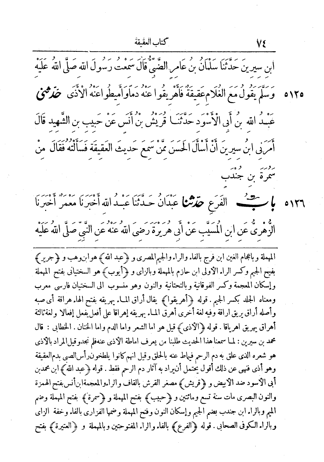 المهملة وبإعجام الغين ابن فرج بالفاء والراء والجيم المصري و (عبد الله) هو ابن وهب و (جرير) بفتح الجيم وكسر الراء الأولى ابن حازم بالمهملة وبالزاي و (أيوب) هو السختياني بفتح المهملة وإسكان المعجمة وكسر الفوقانية وبالتحتانية والنون وهو منسوب إلى السختيان فارسي معرب ومعناه الجلد بكسر الجيم. قوله (أهريقوا) يقال أراق الماء يهريقه بفتح الهاء هراقة أي صبه وأصله أراق يريق إراقة وفيه لغة أخرى أهرق الماء يهريقه إهراقاً على أفعل يفعل إفعالاً ولغة ثالثة أهراق يهريق اهرياقا. قوله (الأذى) قيل هو أما الشعر واما الدم وأما الختان. الخطابي: قال محمد بن سيرين: لما سمعنا هذا الحديث طلبنا من يعرف إماطة الأذى عنه فلم نجد وقيل المراد بالأذى هو شعره الذي علق به دم الرحم فيماط عنه بالحلق وقيل أنهم كانوا يلطخون رأس الصبي بدم العقيقة وهو أذى فنهى عن ذلك أقول يحتمل أن يراد به آثار دم الرحم فقط. قوله (عبد الله) ابن محمد بن أبي الأسود ضد الأبيض و (قريش) مصغر القرش بالقاف والراء والمعجمة ابن أنس بفتح الهمزة والنون البصري مات سنة تسع ومائتين و (حبيب) بفتح المهملة و (سمرة) بفتح المهملة وضم الميم وبالراء ابن جندب بضم الجيم وإسكان النون وفتح المهملة وضمها الفزاري بالفاء وخفة الزاي وبالراء الكوفي الصحابي. قوله (الفرع) بالفاء والراء المفتوحتين وبالمهملة و (العتيرة) بفتح