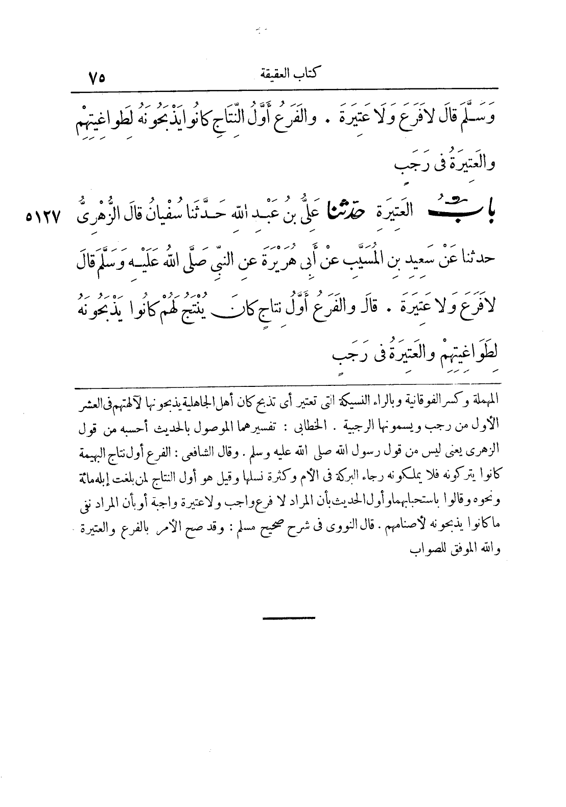 5127 - حَدَّثَنَا عَلِىُّ بْنُ عَبْدِ اللَّهِ حَدَّثَنَا سُفْيَانُ قَالَ الزُّهْرِىُّ حَدَّثَنَا عَنْ سَعِيدِ بْنِ الْمُسَيَّبِ عَنْ أَبِى هُرَيْرَةَ عَنِ النَّبِىِّ - صلى الله عليه وسلم - قَالَ «لاَ فَرَعَ وَلاَ عَتِيرَةَ». قَالَ وَالْفَرَعَ أَوَّلُ نِتَاجٍ كَانَ يُنْتَجُ لَهُمْ، كَانُوا يَذْبَحُونَهُ لِطَوَاغِيتِهِمْ، وَالْعَتِيرَةُ فِى رَجَبٍ.