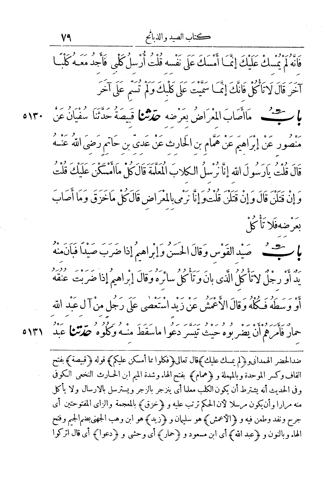 ضد الحضر الهمداني و (لم يمسك عليك) قال تعالى (فكلوا مما امسكن عليكم) قوله (قبيصة) بفتح القاف وكسر الموحدة وبالمهملة و (همام) بفتح الهاء وشدة الميم ابن الحارث النخعي الكوفي وفي الحديث أنه يشترط أن يكون الكلب معلماً أي ينزجر بالزجر ويسترسل بالإرسال ولا يأكل منه مراراً وأن يكون مرسلاً لأن الحكم ترتب عليه و (خزق) بالمعجمة والزاي المفتوحتين أي جرح ونفد وطعن فيه و (الأعمش) هو سليمان و (زبد) هو ابن وهب الجهني بضم الجيم وفتح الهاء وبالنون و (عبد الله) أي ابن مسعود و (حمار) أي وحشي و (دعوا) أي قال اتركوا
