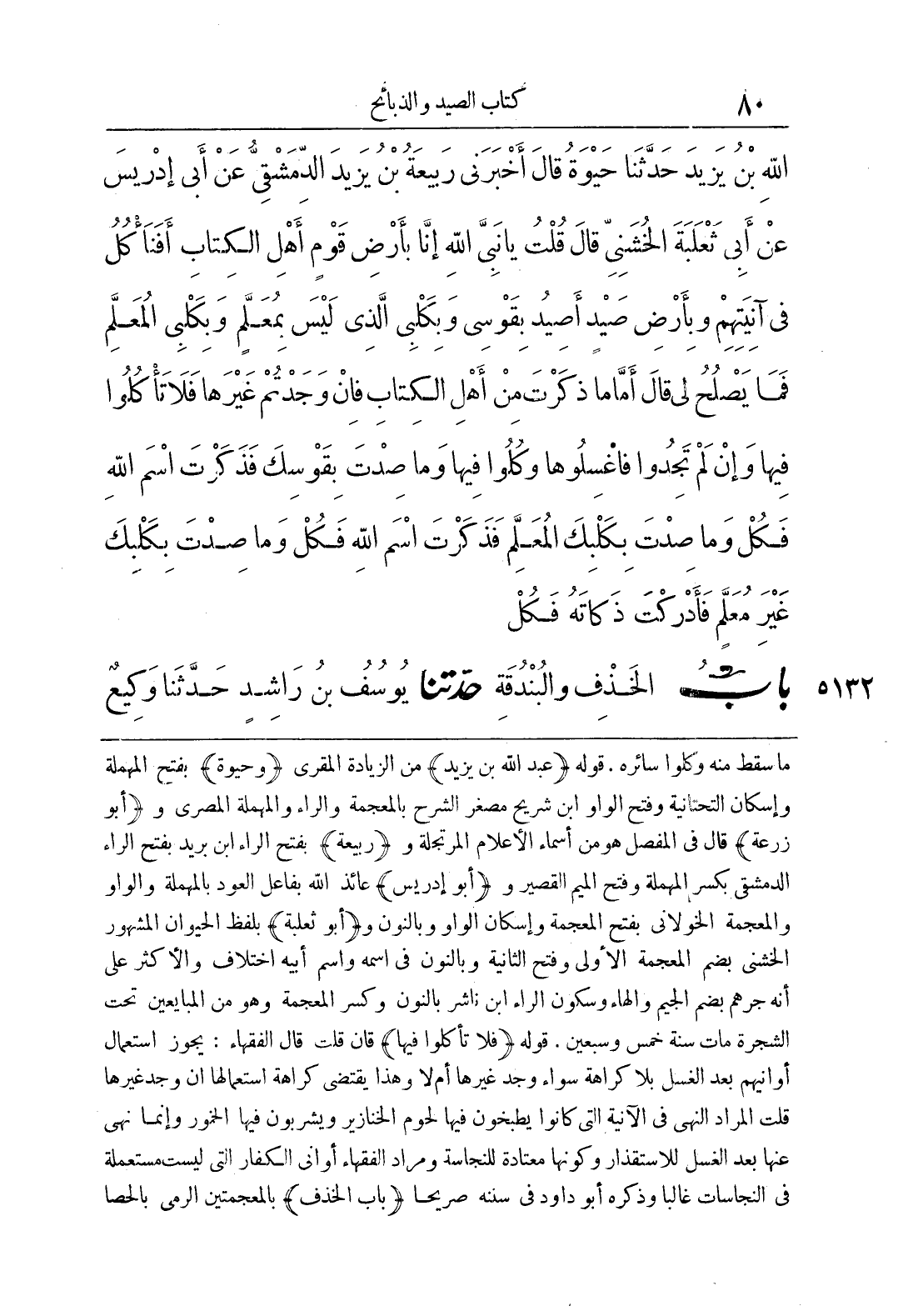 ما سقط منه وكلوا سائره. قوله (عبد الله بن يزيد) من الزيادة المقري (وحيوة) بفتح المهملة وإسكان التحتانية وفتح الواو ابن شريح مصغر الشرح بالمعجمة والراء والمهملة المصري و (أبو زرعة) قال في المفصل هو من أسماء الأعلام المرتجلة و (ربيعة) بفتح الراء ابن بريد بفتح الراء الدمشقي بكسر المهملة وفتح الميم القصير و (أبو إدريس) عائذ الله بفاعل العود بالمهملة والواو والمعجمة الخولاني بفتح المعجمة وإسكان الواو وبالنون و (أبو ثعلبة) بلفظ الحيوان المشهور الخشني بضم المعجمة الأولى وفتح الثانية وبالنون في اسمه واسم أبيه اختلاف والأكثر على أنه جرهم بضم الجيم والهاء وسكون الراء ابن ناشر بالنون وكسر المعجمة وهو من المبايعين تحت الشجرة مات سنة خمس وسبعين. قوله (فلا تأكلوا فيها) فإن قلت قال الفقهاء: يجوز استعمال أوانيهم بعد الغسل بلا كراهة سواء وجد غيرها أم لا وهذا يقتضي كراهة استعمالها ان وجد غيرها قلت المراد النهي في الآنية التي كانوا يطبخون فيها لحوم الخنازير ويشربون فيها الخمور وإنما نهى عنها بعد الغسل للاستقذار وكونها معتادة للنجاسة ومراد الفقهاء أواني الكفار التي ليست مستعملة في النجاسات غالباً وذكره أبو داود في سننه صريحاً (باب الحذف) بالمعجمتين الرمي بالحصا