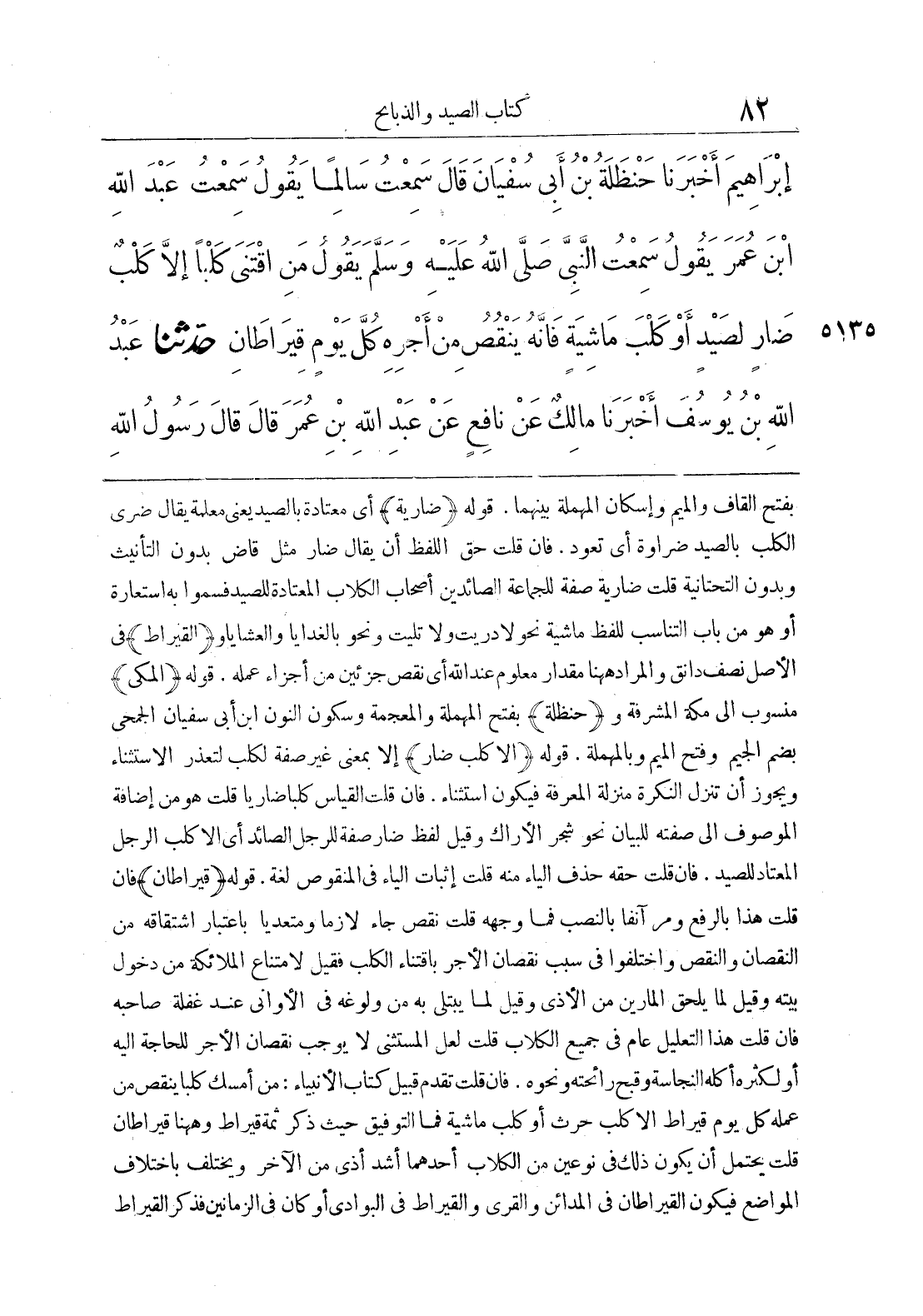 بفتح القاف والميم وإسكان المهملة بينهما. قوله (ضارية) أي معتادة بالصيد يعني معلمة يقال ضري الكلب بالصيد ضراوة أي تعود. فإن قلت حق اللفظ أن يقال ضار مثل قاض بدون التأنيث وبدون التحتانية قلت ضارية صفة للجماعة الصائدين أصحاب الكلاب المعتادة للصيد فسموا به استعارة أو هو من باب التناسب للفظ ماشية نحو لا دريت ولا تليت ونحو بالغدايا والعشايا و (القيراط) في الأصل نصف دانق والمراد ههنا مقدار معلوم عند الله أي نقص جزئين من أجزاء عمله. قوله (المكي) منسوب إلى مكة المشرفة و (حنظلة) بفتح المهملة والمعجمة وسكون النون ابن أبي سفيان الجمحي بضم الجيم وفتح الميم وبالمهملة. قوله (إلا كلب ضار) إلا بمعنى غير صفة لكلب لتعذر الاستثناء ويجوز أن تنزل النكرة منزلة المعرفة فيكون استثناء. فإن قلت القياس كلباً ضارياً قلت هو من إضافة الموصوف إلى صفته للبيان نحو شجر الأراك وقيل لفظ ضار صفة للرجل الصائد أي إلا كلب الرجل المعتاد للصيد. فإن قلت حقه حذف الياء منه قلت إثبات الياء في المنقوص لغة. قوله (قيراطان) فإن قلت هذا بالرفع ومر آنفاً بالنصب فما وجهه قلت نقص جاء لازماً ومتعدياً باعتبار اشتقاقه من النقصان والنقص واختلفوا في سبب نقصان الأجر باقتناء الكلب فقيل لامتناع الملائكة من دخول بيته وقيل لما يلحق المارين من الأذى وقيل لما يبتلى به نم ولوغه في الأواني عند غفلة صاحبه فإن قلت هذا التعليل عام في جميع الكلاب قلت لعل المستثنى لا يوجب نقصان الأجر للحاجة إليه أو لكثرة أكله النجاسة وقبح رائحته ونحوه. فإن قلت تقدم قبيل كتاب الأنبياء: من أمسك كلباً ينقص من عمله كل يوم قيراط إلا كلب حرث أو كلب ماشية فما التوفيق حيث ذكر ثمة قيراط وههنا قيراطان قلت يحتمل أن يكون ذلك في نوعين من الكلاب أحدهما أشد أذى من الآخر ويختلف باختلاف المواضع فيكون القيراطان في المدائن والقرى والقيراط في البوادي أو كان في الزمانين فذكر القيراط