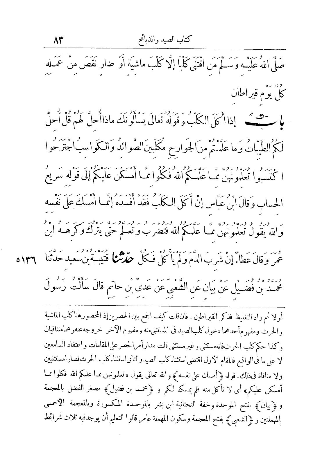 5136 - حَدَّثَنَا قُتَيْبَةُ بْنُ سَعِيدٍ حَدَّثَنَا مُحَمَّدُ بْنُ فُضَيْلٍ عَنْ بَيَانٍ عَنِ الشَّعْبِىِّ عَنْ عَدِىِّ بْنِ حَاتِمٍ قَالَ سَأَلْتُ رَسُولَ