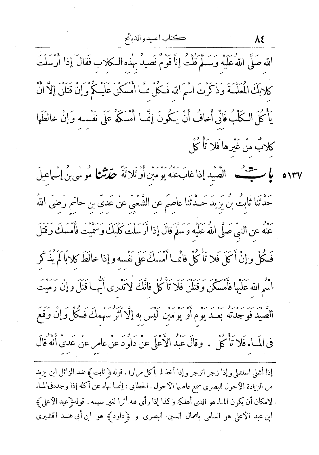 5137 - حَدَّثَنَا مُوسَى بْنُ إِسْمَاعِيلَ حَدَّثَنَا ثَابِتُ بْنُ يَزِيدَ حَدَّثَنَا عَاصِمٌ عَنِ الشَّعْبِىِّ عَنْ عَدِىِّ بْنِ حَاتِمٍ - رضى الله عنه - عَنِ النَّبِىِّ - صلى الله عليه وسلم - قَالَ «إِذَا أَرْسَلْتَ كَلْبَكَ وَسَمَّيْتَ فَأَمْسَكَ وَقَتَلَ، فَكُلْ، وَإِنْ أَكَلَ فَلاَ تَاكُلْ، فَإِنَّمَا أَمْسَكَ عَلَى نَفْسِهِ، وَإِذَا خَالَطَ كِلاَباً لَمْ يُذْكَرِ اسْمُ اللَّهِ عَلَيْهَا فَأَمْسَكْنَ وَقَتَلْنَ فَلاَ تَاكُلْ، فَإِنَّكَ لاَ تَدْرِى أَيُّهَا قَتَلَ، وَإِنْ رَمَيْتَ الصَّيْدَ فَوَجَدْتَهُ بَعْدَ يَوْمٍ أَوْ يَوْمَيْنِ، لَيْسَ بِهِ إِلاَّ أَثَرُ سَهْمِكَ، فَكُلْ، وَإِنْ وَقَعَ فِى الْمَاءِ فَلاَ تَاكُلْ». وَقَالَ عَبْدُ الأَعْلَى عَنْ دَاوُدَ عَنْ عَامِرٍ عَنْ عَدِىٍّ أَنَّهُ قَالَ
