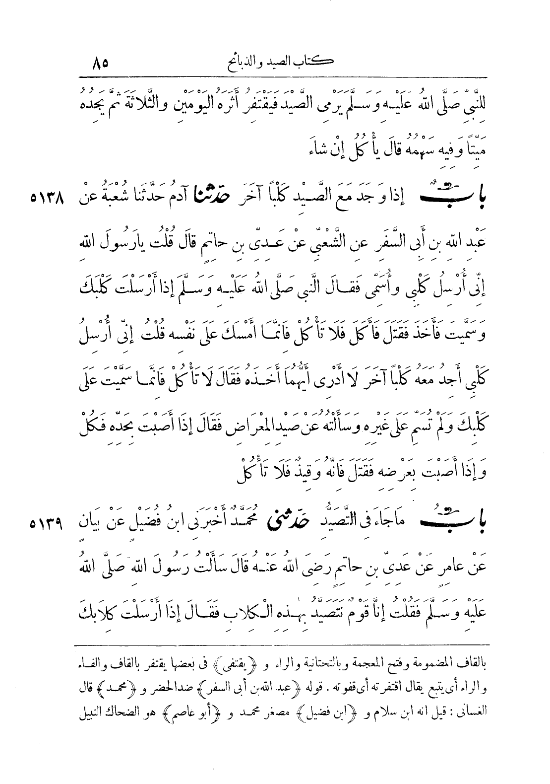 5139 - حَدَّثَنِى مُحَمَّدٌ أَخْبَرَنِى ابْنُ فُضَيْلٍ عَنْ بَيَانٍ عَنْ عَامِرٍ عَنْ عَدِىِّ بْنِ حَاتِمٍ - رضى الله عنه - قَالَ سَأَلْتُ رَسُولَ اللَّهِ - صلى الله عليه وسلم - فَقُلْتُ إِنَّا قَوْمٌ نَتَصَيَّدُ بِهَذِهِ الْكِلاَبِ. فَقَالَ «إِذَا أَرْسَلْتَ كِلاَبَكَ