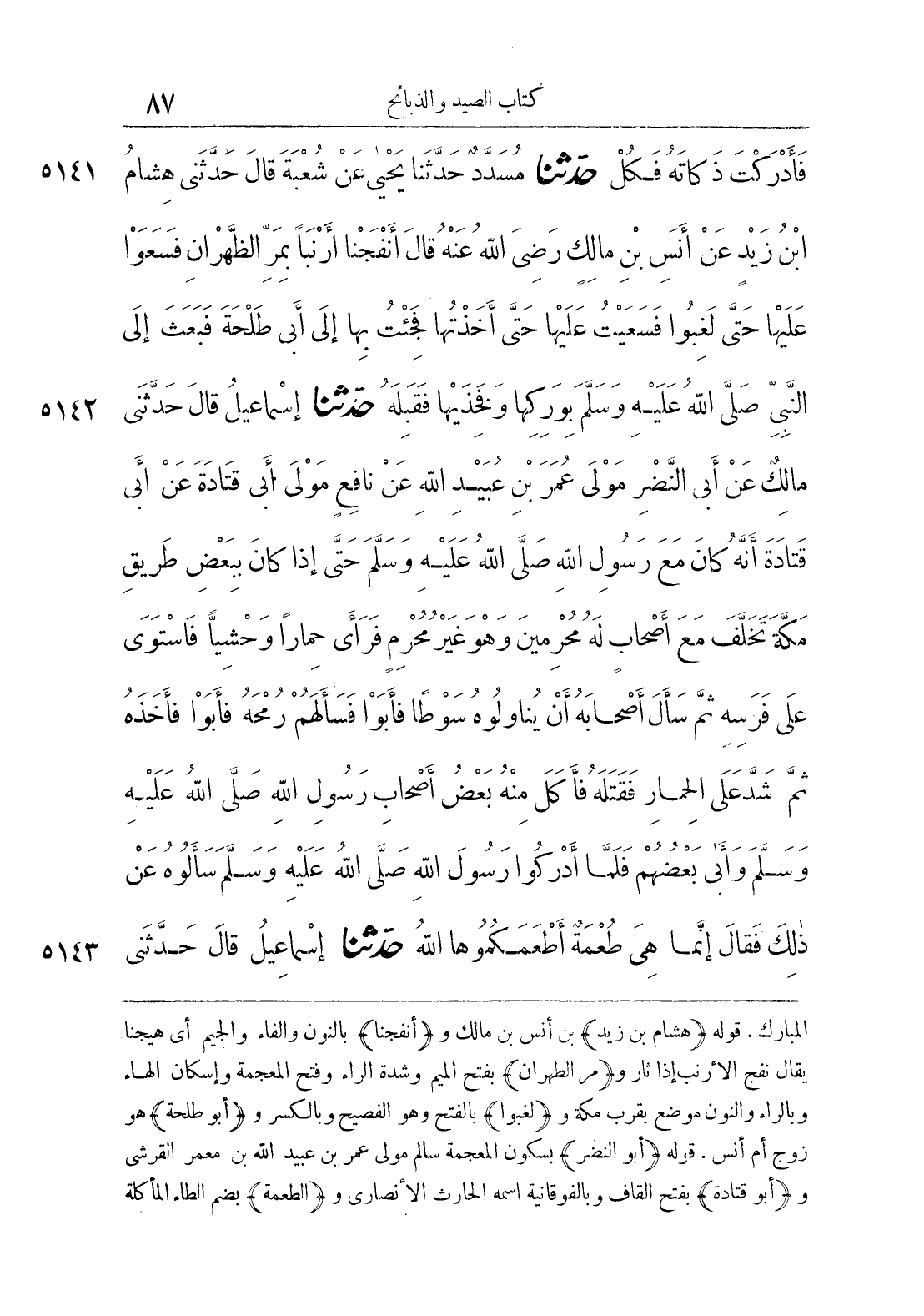 5142 - حَدَّثَنَا إِسْمَاعِيلُ قَالَ حَدَّثَنِى مَالِكٌ عَنْ أَبِى النَّضْرِ مَوْلَى عُمَرَ بْنِ عُبَيْدِ اللَّهِ عَنْ نَافِعٍ مَوْلَى أَبِى قَتَادَةَ عَنْ أَبِى قَتَادَةَ أَنَّهُ كَانَ مَعَ رَسُولِ اللَّهِ - صلى الله عليه وسلم - حَتَّى إِذَا كَانَ بِبَعْضِ طَرِيقِ مَكَّةَ تَخَلَّفَ مَعَ أَصْحَابٍ لَهُ مُحْرِمِينَ، وَهْوَ غَيْرُ مُحْرِمٍ، فَرَأَى حِمَاراً وَحْشِيًّا، فَاسْتَوَى عَلَى فَرَسِهِ، ثُمَّ سَأَلَ أَصْحَابَهُ أَنْ يُنَاوِلُوهُ سَوْطاً، فَأَبَوْا فَسَأَلَهُمْ رُمْحَهُ فَأَبَوْا فَأَخَذَهُ ثُمَّ شَدَّ عَلَى الْحِمَارِ، فَقَتَلَهُ فَأَكَلَ مِنْهُ بَعْضُ أَصْحَابِ رَسُولِ اللَّهِ - صلى الله عليه وسلم - وَأَبَى بَعْضُهُمْ، فَلَمَّا أَدْرَكُوا رَسُولَ اللَّهِ - صلى الله عليه وسلم - سَأَلُوهُ عَنْ ذَلِكَ فَقَالَ «إِنَّمَا هِىَ طُعْمَةٌ أَطْعَمَكُمُوهَا اللَّهُ».