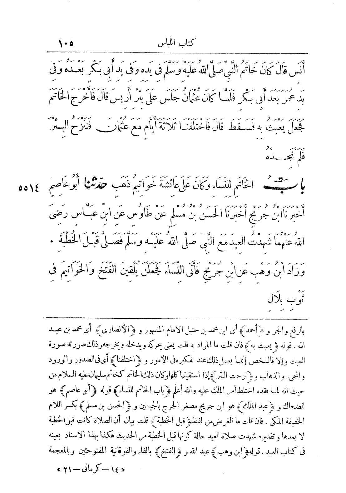 بالرفع والجر و {أحمد} أي ابن محمد بن حنبل الإمام المشهور و {الأنصاري} أي محمد بن عبد الله. قوله {يعبث به} فإن قلت ما المراد به قلت يعني يحركه ويدخله ويخرجه وذلك صورته صورة العبث وإلا فالشخص إنما يعمل ذلك عند تفكيره في الأمور و {اختلفنا} أي في الصدور والورود والمجيء والذهاب و {نزحت البئر} إذا استقيتها كلها وكان ذلك الخاتم كخاتم سليمان عليه السلام من حيث أنه لما فقده اختلط أمر الملك عليه والله أعلم. {باب الخاتم للنساء} قوله {أبو عاصم} هو الضحاك و {عبد الملك} هو ابن جريج مصغر الجرج بالجيمين و {الحسن بن مسلم} بكسر اللام الخفيفة المكي، فإن قلت ما الغرض من لفظ {قبل الخطبة} قلت بيان أن الصلاة كانت قبل الخطبة لا بعدها وتقديره شهدت صلاة العيد حالة كونها قبل الخطبة مر الحديث هكذا بهذا الإسناد بعينه في كتاب العيد. قوله {ابن وهب} عبد الله و {الفتخ} بالفاء والفوقانية المفتوحتين وبالمعجمة