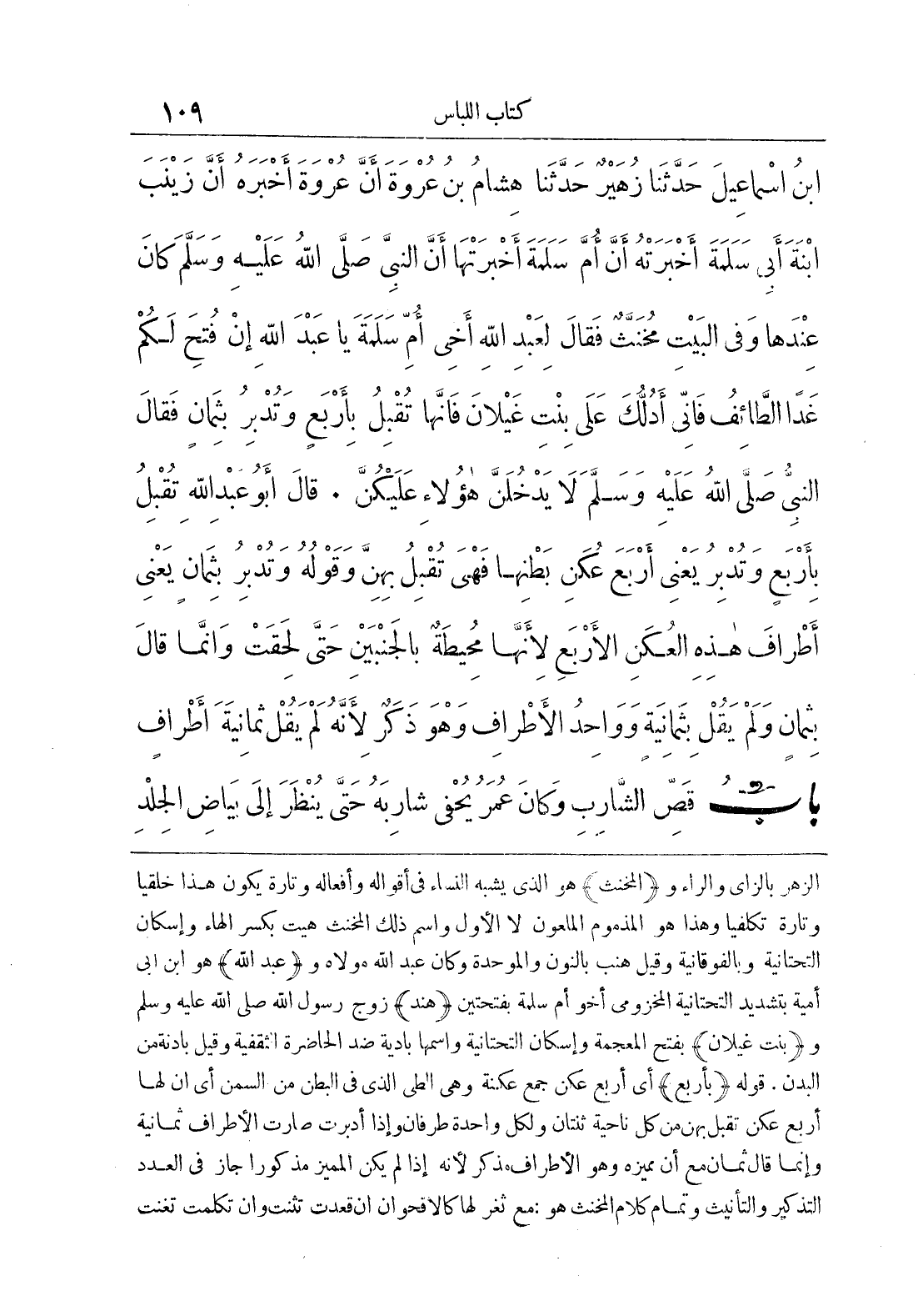 الزهر بالزاي والراء و {المخنث} هو الذي يشبه النساء في أقواله وأفعاله وتارة يكون هذا خلقيا وتارة يكون هذا تكلفيا وهذا هو المذموم الملعون لا الأول واسم ذلك المخنث هيت بكسر الهاء وإسكان التحتانية وبالفوقانية وقيل هنب بالنون والموحدة وكان عبد الله مولاه و {عبد الله} هو ابن أبي أمية بتشديد التحتانية المخزومي أخو أم سلمة بفتحتين {هند} زوج رسول الله صلى الله عليه وسلم و {بنت غيلان} بفتح المعجمة وإسكان التحتانية واسمها بادية ضد الحاضرة الثقفية وقيل بادنة من البدن. قوله {بأربع} أي أربع عكن جمع عكنة وهي الطي الذي في البطن من السمن أي أن لها أربع عكن تقبل بهن من كل ناحية ثنتان ولكل واحدة طرفان وإذا أدبرت صارت الأطراف ثمانية وإنما قال ثمان مع أن مميزه هو الأطراف مذكر لأنه إذا لم يكن المميز مذكورا جاز في العدد التذكير والتأنيث وتمام كلام المخنث هو: مع ثغر لها كالأقحوان إن قعدت تثنت وإن تكلمت تغنت