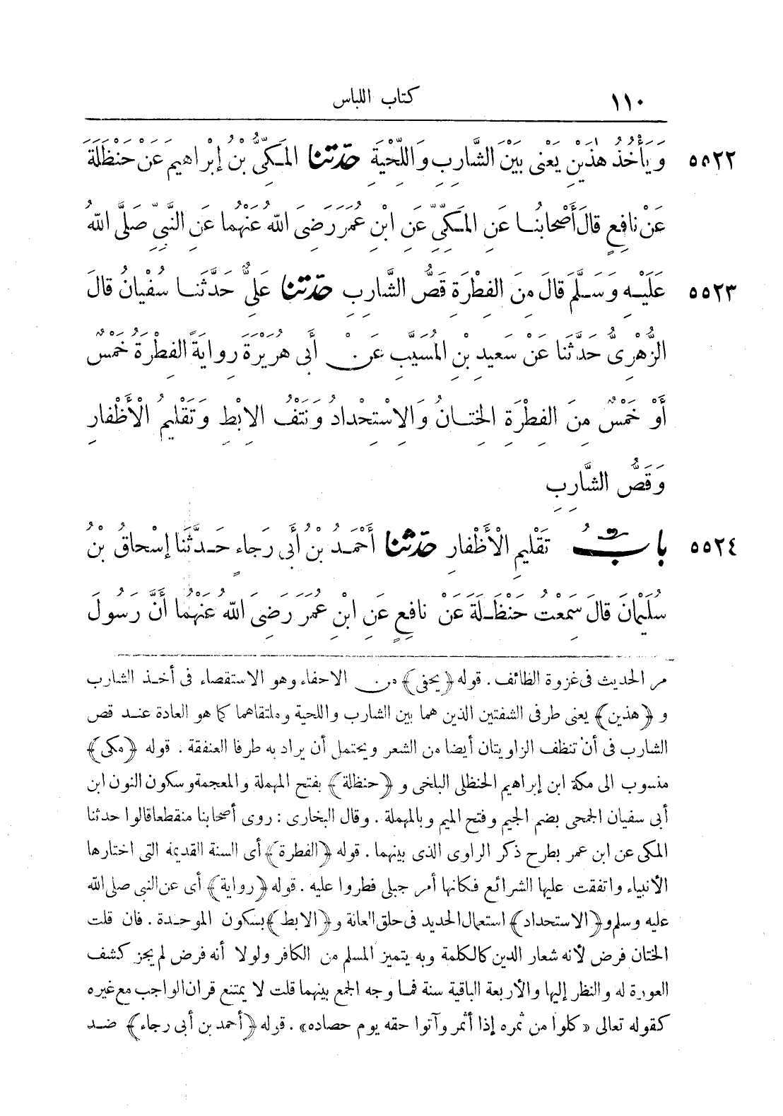 مر الحديث في غزوة الطائف. {باب قص الشارب} قوله {يحفي} من الإحفاء وهو الاستقصاء في أخذ الشارب و {هذين} يعني طرفي الشفتين الذين هما بين الشارب واللحية وملتقاهما كما هو العادة عند قص الشارب في أن تنظف الزاويتان أيضا من الشعر ويحتمل أن يراد به طرفا العنفقة. قوله {مكي} منسوب إلى مكة ابن إبراهيم الحنظلي البلخي و {حنظلة} بفتح المهملة والمعجمة وسكون النون ابن أبي سفيان الجمحي بضم الجيم وفتح الميم وبالمهملة، وقال البخاري: روى أصحابنا منقطعا قالوا حدثنا المكي عن ابن عمر بطرح ذكر الراوي الذي بينهما. قوله {الفطرة} أي السنة القديمة التي اختارها الأنبياء واتفقت عليها الشرائع فكأنها أمر جبلي فطروا عليه. قوله {رواية} أي عن النبي صلى الله عليه وسلم و {الإستحداد} استعمال الحديد في حلق العانة و {الإبط} بسكون الموحدة. فإن قلت الختان فرض لأنه شعار الدين كالكلمة وبه يتميز المسلم من الكافر ولولا أنه فرض لم يجز كشف العورة له والنظر إليها والأربع الباقية سنة فما وجه الجمع بينهما قلت لا يمتنع قران الواجب مع غيره كقوله تعالى " كلوا من ثمره إذا أثمر وآتوا حقه يوم حصاده " {باب تقليم الأظافر} قوله {أحمد بن أبي رجاء} ضد