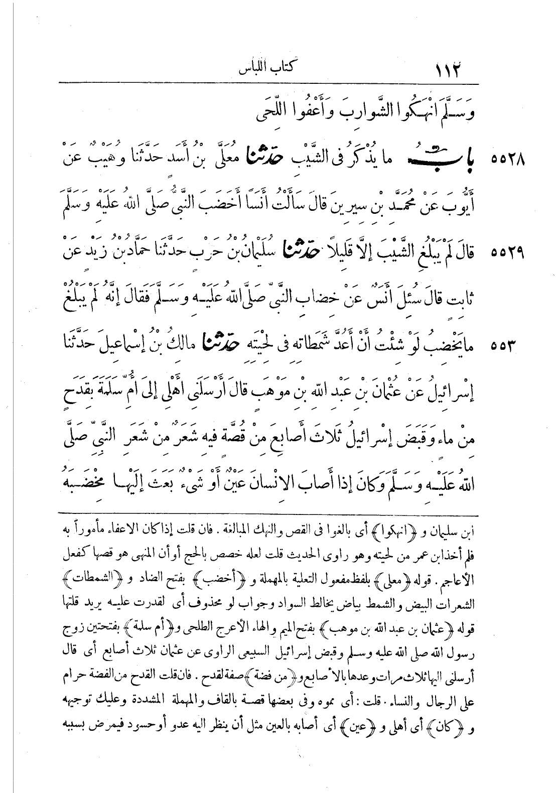 ابن سليمان و {أنهكوا} أي بالغوا في القص والنهك المبالغة، فإن قلت إذا كان الإعفاء مأمورا به فلم أخذ ابن عمر من لحيته وهو راوي الحديث قلت لعله خصص بالحج أو أن المنهي هو قصها كفعل الأعاجم. {باب ما يذكر في الشيب} قوله {معلى} بلفظ مفعول التعلية بالمهملة و {أخضب} بفتح الضاد و {الشمطات} الشعرات البيض والشمط بياض يخالط السواد وجواب لو محذوف أي لقدرت عليه يريد قلتها. قوله {عثمان بن عبد الله بن موهب} بفتح الميم والهاء الأعرج الطلحي و {أم سلمة} بفتحتين زوج رسول الله صلى الله عليه وسلم وقبض إسرائيل السبيعي الراوي عن عثمان ثلاث أصابع أي قال أرسلني إليها ثلاث مرات وعدها بالأصابع و {من فضة} صفة لقدح، فإن قلت القدح من الفضة حرام على الرجال والنساء قلت: أي مموه وفي بعضها قصة بالقاف والمهملة المشددة وعليك توجيهه و {كان} أي أهلي و {عين} أي أصابه بالعين مثل أن ينظر إليه عدو أو حسود فيمرض بسببه