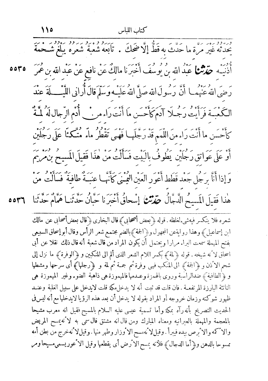 5535 - حَدَّثَنَا عَبْدُ اللَّهِ بْنُ يُوسُفَ أَخْبَرَنَا مَالِكٌ عَنْ نَافِعٍ عَنْ عَبْدِ اللَّهِ بْنِ عُمَرَ رَضِيَ اللَّهُ عَنْهُمَا أَنَّ رَسُولَ اللَّهِ صَلَّى اللَّهُ عَلَيْهِ وَسَلَّمَ قَالَ أُرَانِي اللَّيْلَةَ عِنْدَ الْكَعْبَةِ فَرَأَيْتُ رَجُلًا آدَمَ كَأَحْسَنِ مَا أَنْتَ رَاءٍ مِنْ أُدْمِ الرِّجَالِ لَهُ لِمَّةٌ كَأَحْسَنِ مَا أَنْتَ رَاءٍ مِنْ اللِّمَمِ قَدْ رَجَّلَهَا فَهِيَ تَقْطُرُ مَاءً مُتَّكِئًا عَلَى رَجُلَيْنِ أَوْ عَلَى عَوَاتِقِ رَجُلَيْنِ يَطُوفُ بِالْبَيْتِ فَسَأَلْتُ مَنْ هَذَا فَقِيلَ الْمَسِيحُ ابْنُ مَرْيَمَ وَإِذَا أَنَا بِرَجُلٍ جَعْدٍ قَطَطٍ أَعْوَرِ الْعَيْنِ الْيُمْنَى كَأَنَّهَا عِنَبَةٌ طَافِيَةٌ فَسَأَلْتُ مَنْ هَذَا فَقِيلَ الْمَسِيحُ الدَّجَّالُ