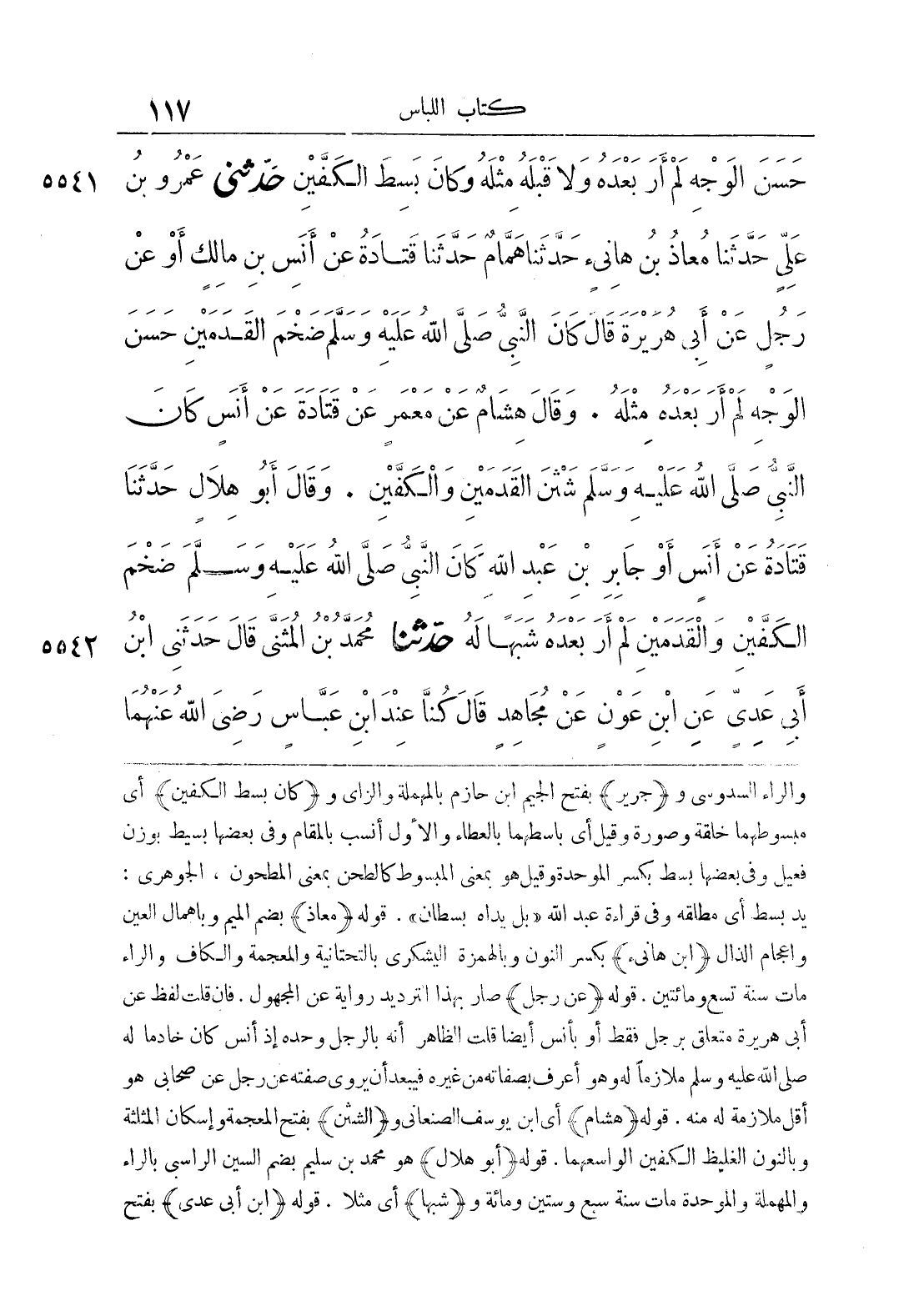 5541 - حَدَّثَنِي عَمْرُو بْنُ عَلِيٍّ حَدَّثَنَا مُعَاذُ بْنُ هَانِئٍ حَدَّثَنَا هَمَّامٌ حَدَّثَنَا قَتَادَةُ عَنْ أَنَسِ بْنِ مَالِكٍ أَوْ عَنْ رَجُلٍ عَنْ أَبِي هُرَيْرَةَ قَالَ كَانَ النَّبِيُّ صَلَّى اللَّهُ عَلَيْهِ وَسَلَّمَ ضَخْمَ الْقَدَمَيْنِ حَسَنَ الْوَجْهِ لَمْ أَرَ بَعْدَهُ مِثْلَهُ وَقَالَ هِشَامٌ عَنْ مَعْمَرٍ عَنْ قَتَادَةَ عَنْ أَنَسٍ كَانَ النَّبِيُّ صَلَّى اللَّهُ عَلَيْهِ وَسَلَّمَ شَثْنَ الْقَدَمَيْنِ وَالْكَفَّيْنِ وَقَالَ أَبُو هِلَالٍ حَدَّثَنَا قَتَادَةُ عَنْ أَنَسٍ أَوْ جَابِرِ بْنِ عَبْدِ اللَّهِ كَانَ النَّبِيُّ صَلَّى اللَّهُ عَلَيْهِ وَسَلَّمَ ضَخْمَ الْكَفَّيْنِ وَالْقَدَمَيْنِ لَمْ أَرَ بَعْدَهُ شَبَهًا لَهُ