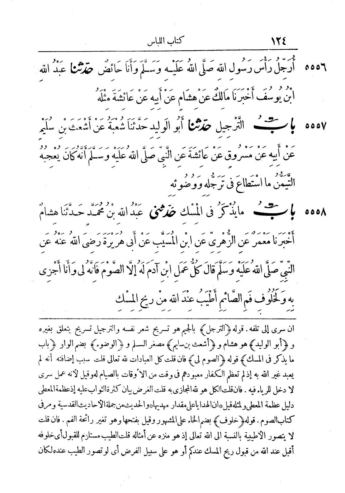 إن سرى إلى تلفه، {باب الترجيل} قوله {الترجل} بالجيم هو تسريح شعر نفسه والترجيل تسريح يتعلق بغيره و {أبو الوليد} هو هشام و {أشعث بن سليم} مصغر السلم و {الوضوء} بضم الواو. {باب ما يذكر في المسك} قوله {الصوم لي} فإن قلت كل العبادات لله تعالى قلت سبب إضافته أنه لم يعبد غير الله به إذ لم تعظم الكفار معبودهم في وقت من الأوقات بالصيام له وقيل لأنه عمل سري لا دخل للرياء فيه، فإن قلت الكل هو لله المجازي به قلت الغرض بيان كثرة الثواب عليه إذ عظمة المعطي دليل عظمة المعطى ولمثله قيل *إن الهدايا على مقدار مهديها* والحديث من جملة الأحاديث القدسية ومر في كتاب الصوم. قوله {خلوف} بضم الخاء على المشهور وقيل بفتحها وهو تغير رائحة الفم. فإن قلت لا يتصور الأطيبية بالنسبة إلى الله تعالى إذ هو منزه عن أمثاله قلت الطيب مستلزم للقبول أي خلوفه أقبل عند الله من قبول ريح المسك عندكم أو هو على سبيل الفرض أي أو تصور الطيب عنده لكان