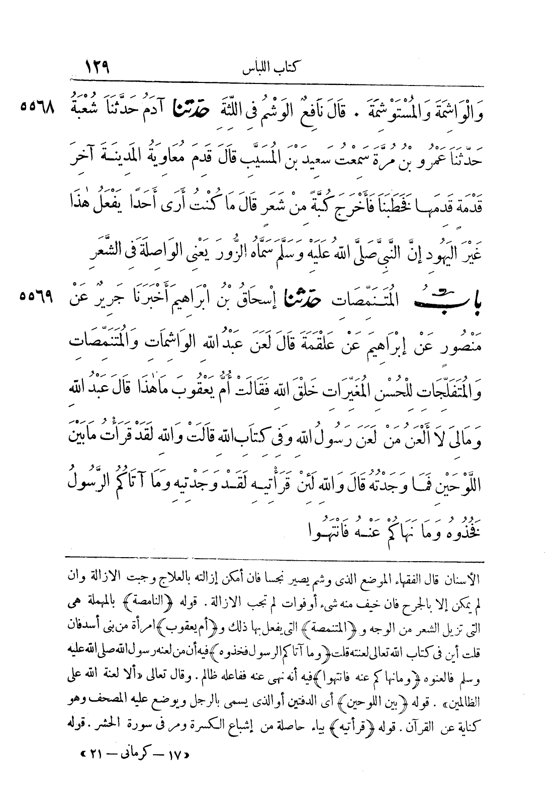 الأسنان قال الفقهاء الموضع الذي وشم صار نجسا فإن أمكن إزالته بالعلاج وجبت الإزالة وإن لم يمكن إلا بالجرح فإن خيف منه شيء أو فوات لم تجب الإزالة، {باب المتنمصات} قوله {النامصة} بالمهملة هي التي تزيل الشعر من الوجه و {المتنمصة} التي يفعل بها ذلك و {أم يعقوب} امرأة من بني أسد فإن قلت أين في كتاب الله لعنته قلت {وما آتاكم الرسول فخذوه} فيه أن من لعنه رسول الله صلى الله عليه وسلم فالعنوه {وما نهاكم عنه فانتهوا} فيه أنه نهى عنه ففاعله ظالم، وقال تعالى " ألا لعنة الله على الظالمين "، قوله {بين اللوحين} أي الدفتين أو الذي يسمى بالرجل ويوضع عليه المصحف وهو كناية عن القرآن. قوله {قرأتيه} بياء حاصلة من إشباع الكسرة ومر في سورة الحشر. قوله