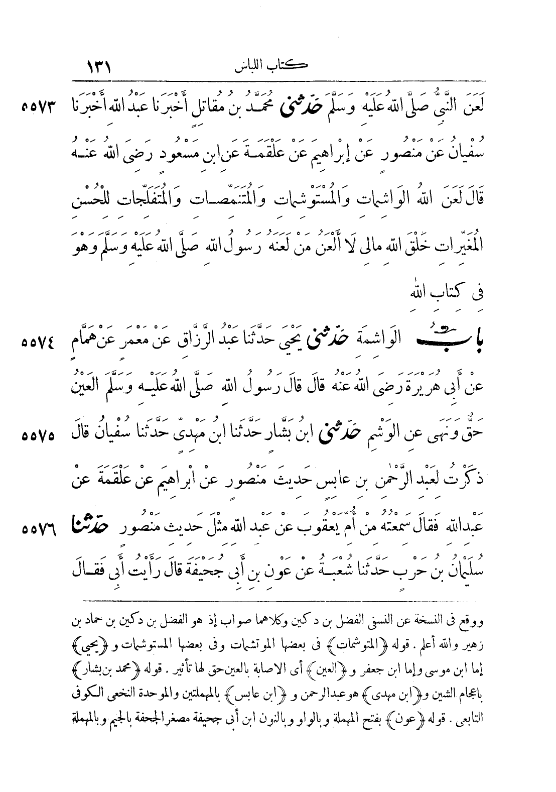 ووقع في النسخة عن النسفي ابن دكين وكلاهما صواب إذ هو الفضل بن دكين بن حماد بن زهير والله أعلم. قوله {المتوشمات} في بعضها الموتشمات وفي بعضها المستوشمات، {باب الواشمة} {يحيى} إما ابن موسى وإما ابن جعفر و {العين} أي الإصابة بالعين حق لها تأثير. قوله {محمد بن بشار} بإعجام الشين و {ابن مهدي} هو عبد الرحمن و {ابن عابس} بالمهملتين والموحدة النخعي الكوفي التابعي. قوله {عون} بفتح المهملة وبالواو وبالنون ابن أبي جحيفة مصغر الجحفة بالجيم وبالمهملة