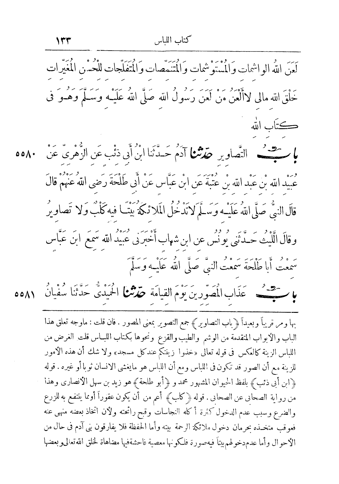 بها ومر قريبا وبعيدا {باب التصاوير} جمع التصوير بمعنى المصور. فإن قلت: ما وجه تعلق هذا الباب والأبواب المتقدمة من الوشم والطيب والقزع ونحوها بكتاب اللباس قلت الغرض من اللباس الزينة كالعكس في قوله تعالى " خذوا زينتكم عند كل مسجد " ولا شك أن هذه الأمور للزينة مع أن الصور قد تكون في اللباس ومع أن اللباس هو ما يغشى الإنسان ثوبا أو غيره. قوله {ابن أبي ذئب} بلفظ الحيوان المشهور محمد و {أبو طلحة} هو زيد بن سهل الأنصاري وهذا من رواية الصحابي عن الصحابي. قوله {كلب} أعم من أن يكون عقورا أو مما ينتفع به للزرع والضرع وسبب عدم الدخول كثرة أكله النجاسات وقبح رائحته ولأن اتخاذ بعضه منهي عنه فعوقب متخذه بحرمان دخول ملائكة الرحمة بيته وأما الحفظة فلا يفارقون بني آدم في حال من الأحوال وأما عدم دخولهم بيتا فيه صورة فلكونها معصية فاحشة فيها مضاهاة لخلق الله تعالى وبعضها
