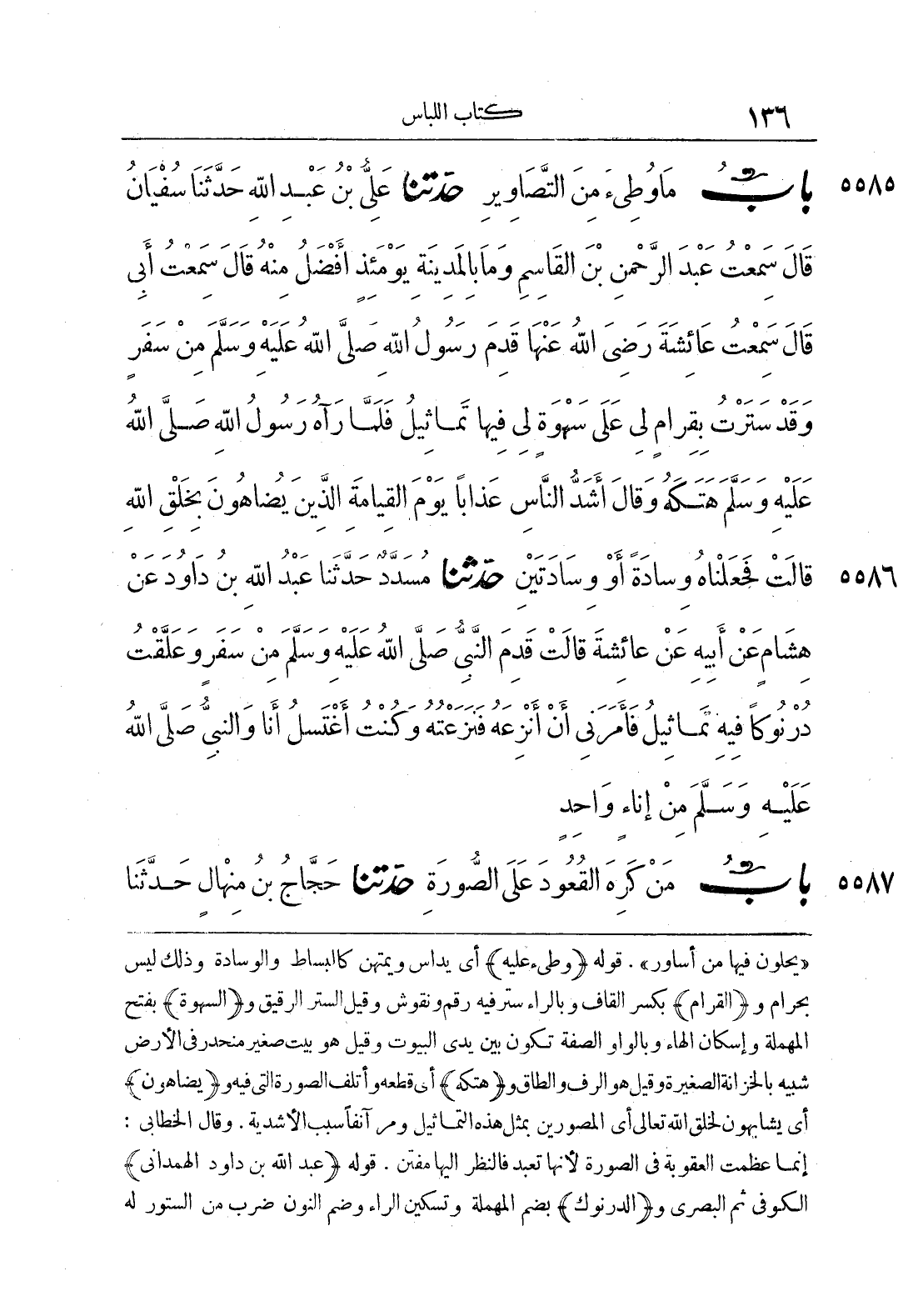 "يحلّون فيها من أساور". {باب من وطئ من التصاوير} قوله {وطئ عليه} أي يداس ويمتهن كالبساط والوسادة وذلك ليس بحرام و {القرام} بكسر القاف والراء ستر فيه رقم ونقوش وقيل الستر الرقيق و {السهوة} بفتح المهملة وإسكان الهاء وبالواو الصفة تكون بين يدي البيوت وقيل هو بيت صغير منحدر في الأرض شبيه بالخزانة الصغيرة وقيل هو الرف والطاق و {هتكه} أي قطعه وأتلف الصورة التي فيه و {يضاهون} أي يشابهون لخلق الله تعالى أي المصورين بمثل هذه التماثيل ومر آنفا سبب الأشدية. وقال الخطابي: إنما عظمت العقوبة في الصورة لأنها تعبد فالنظر إليها مفتن. قوله {عبد الله بن داود الهمداني} الكوفي ثم البصري و {الدرنوك} بضم المهملة وتسكين الراء وضم النون ضرب من الستور له