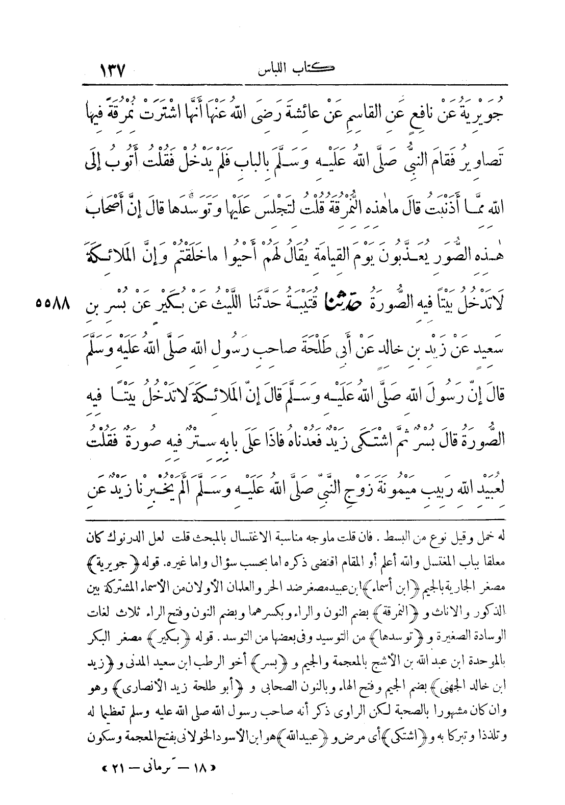 5588 - حَدَّثَنَا قُتَيْبَةُ حَدَّثَنَا اللَّيْثُ عَنْ بُكَيْرٍ عَنْ بُسْرِ بْنِ سَعِيدٍ عَنْ زَيْدِ بْنِ خَالِدٍ عَنْ أَبِي طَلْحَةَ صَاحِبِ رَسُولِ اللَّهِ صَلَّى اللَّهُ عَلَيْهِ وَسَلَّمَ قَالَ إِنَّ رَسُولَ اللَّهِ صَلَّى اللَّهُ عَلَيْهِ وَسَلَّمَ قَالَ إِنَّ الْمَلَائِكَةَ لَا تَدْخُلُ بَيْتًا فِيهِ الصُّورَةُ قَالَ بُسْرٌ ثُمَّ اشْتَكَى زَيْدٌ فَعُدْنَاهُ فَإِذَا عَلَى بَابِهِ سِتْرٌ فِيهِ صُورَةٌ فَقُلْتُ لِعُبَيْدِاللَّهِ رَبِيبِ مَيْمُونَةَ زَوْجِ النَّبِيِّ صَلَّى اللَّهُ عَلَيْهِ وَسَلَّمَ أَلَمْ يُخْبِرْنَا زَيْدٌ عَنْ
